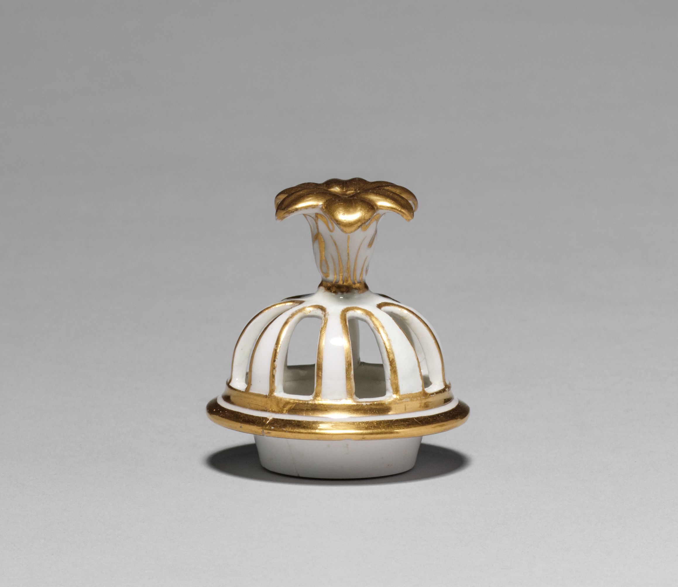 White ceramic object with gold accents, resembling a miniature dome-shaped cage or lantern. The object has a rounded base, a domed top with vertical gold lines and rectangular cutouts, and a short stem with a flared gold top. Gold accents are present on the rim, stem and top.