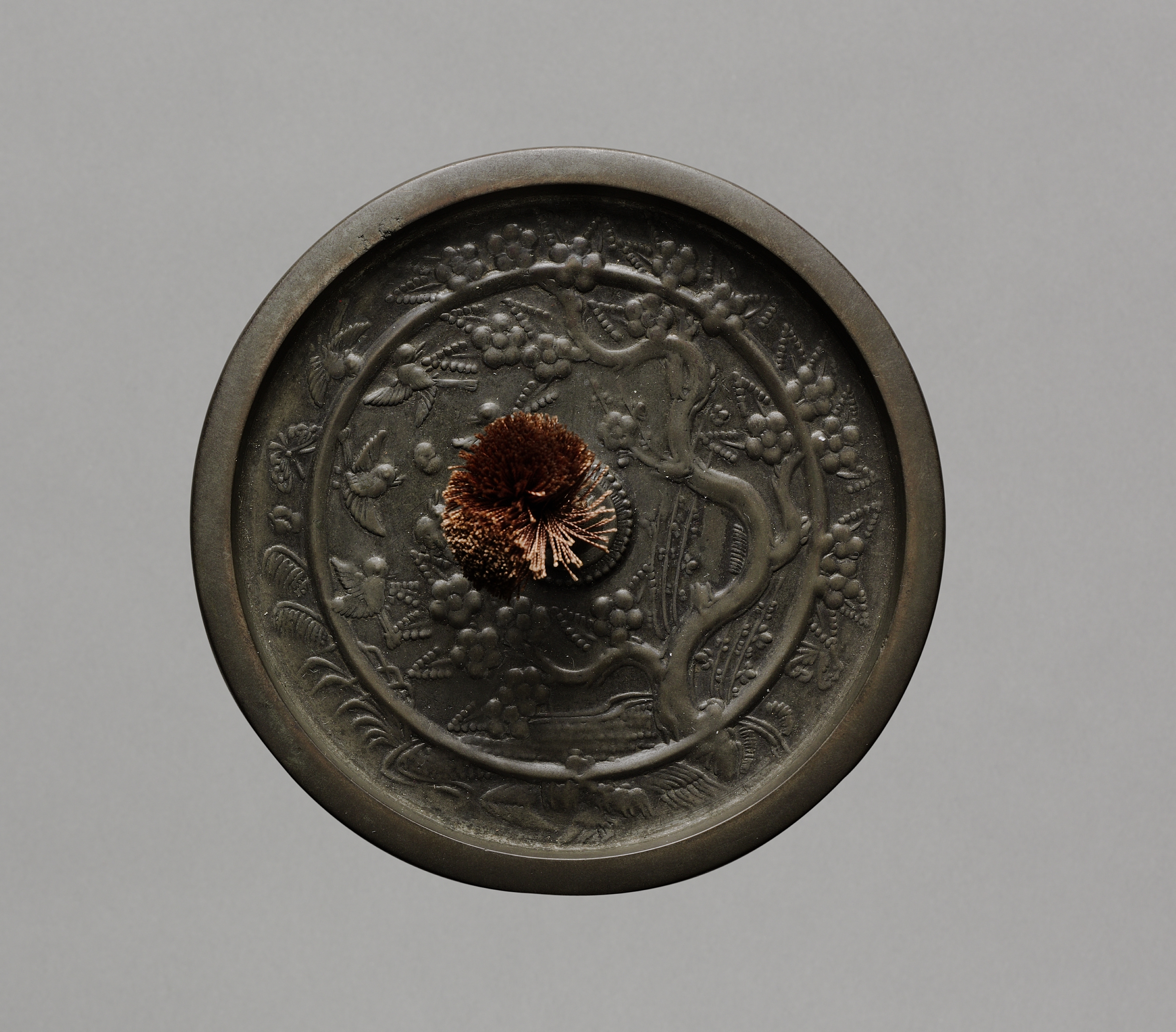 Round, dark gray metal object with raised circular design. The design features a tree branch with leaves and berries in the center. A small, round, brown and gold-colored object is attached to the center. The background is solid grey. The title of the object is "Mirror" by an unknown artist.