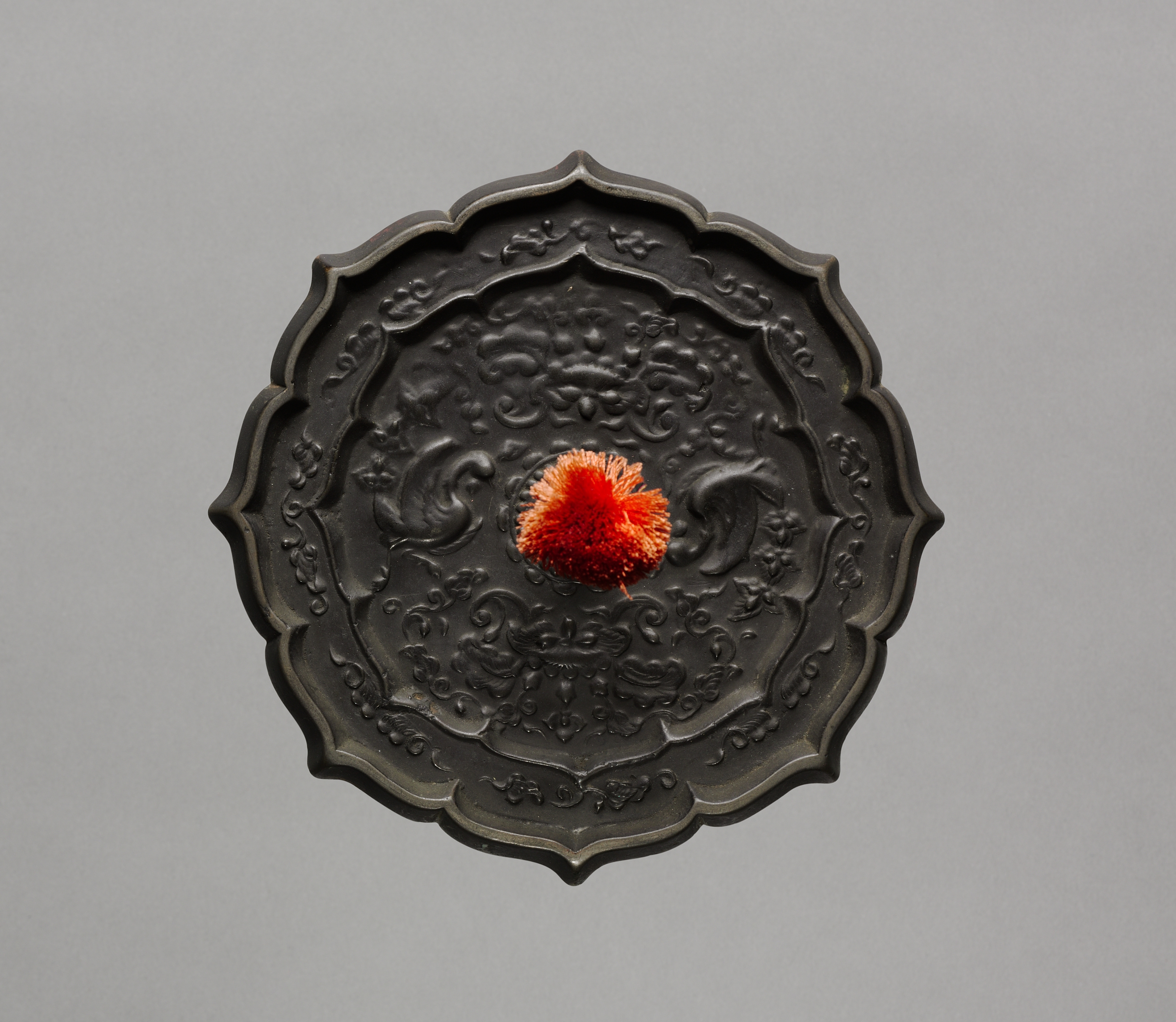 Dark gray metal plate with a scalloped edge, featuring an embossed design of floral patterns and swirling lines. The plate has a raised edge and a central circular area with a small, round indentation. A bright orange-red pom-pom or fluffy ball sits in the center of the plate. The plate appears to be made of metal, possibly bronze or copper, with a dark patina. The background is a solid light gray color. Title: Mirror. Artist: not specified.