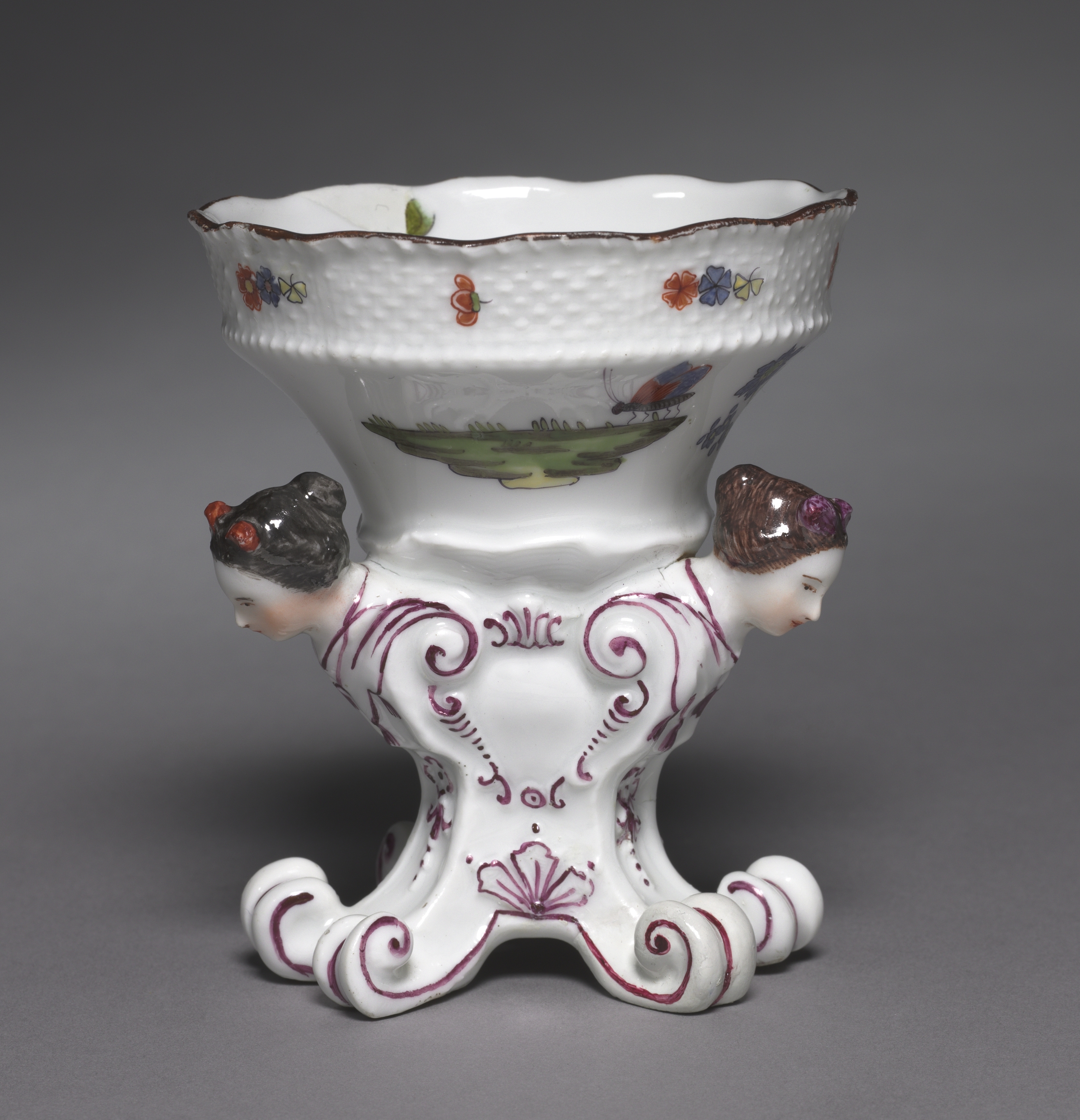 White porcelain object with a wide, shallow bowl and a decorative base. The bowl has a wavy edge with brown trim and features colorful floral and insect designs on its exterior. The base has a purple design and two human-like figures on either side, each with their heads peeking out. The figures have distinct hair colors and styles. The base has three curved feet. The background is a gradient of gray.
