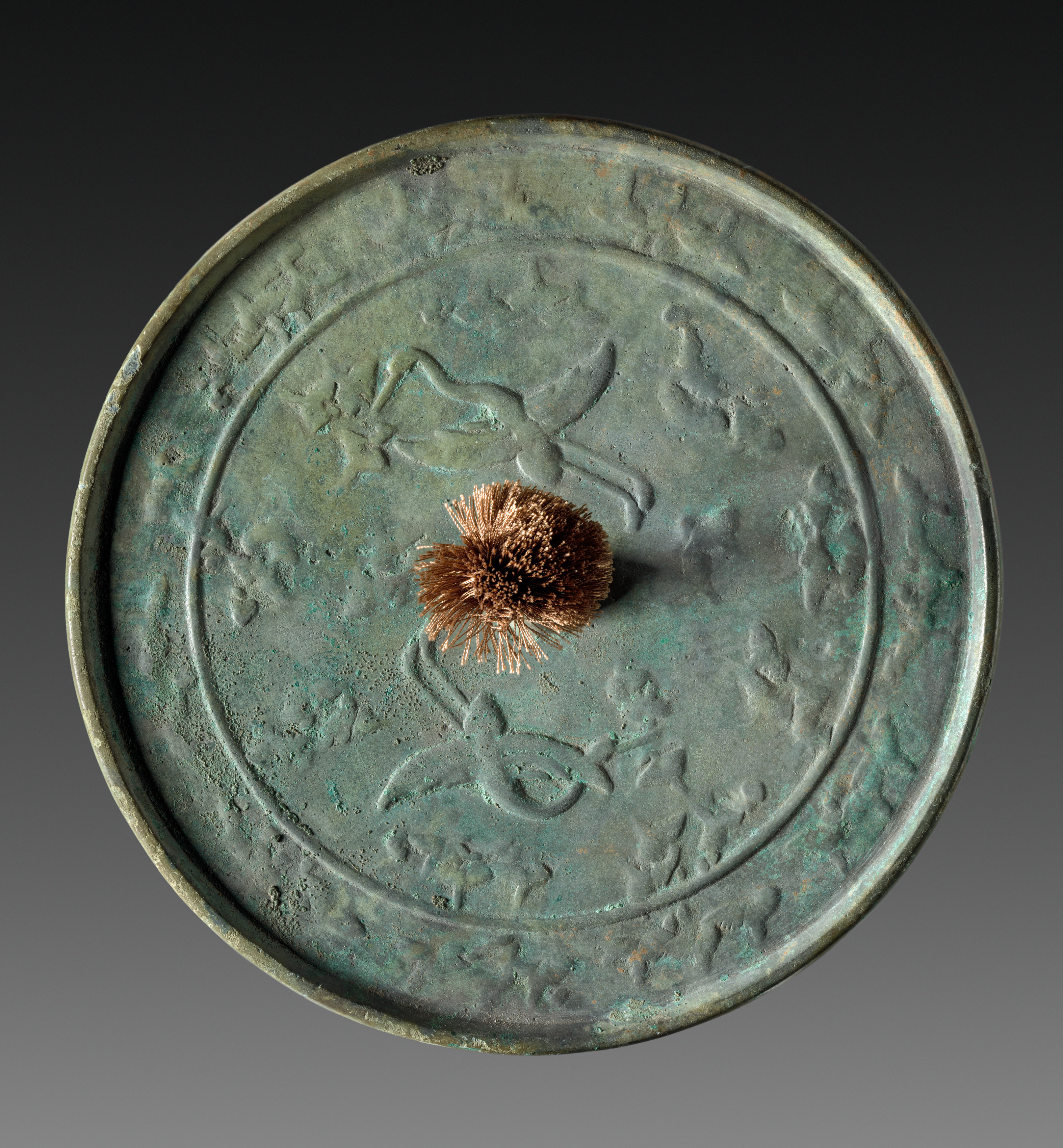 Round, flat, bronze-colored object with a raised edge. The surface is greenish with areas of lighter and darker patina. A raised circle in the center; two long-necked cranes are on either side with heads facing inwards; bodies and tails extend to the outer edge. A ring of raised designs around the inner circle. A small bunch of thin, bronze-colored fibers protruding from the center. Background transitions from black at top to grey at bottom. Mirror with Pair of Cranes by Unknown.