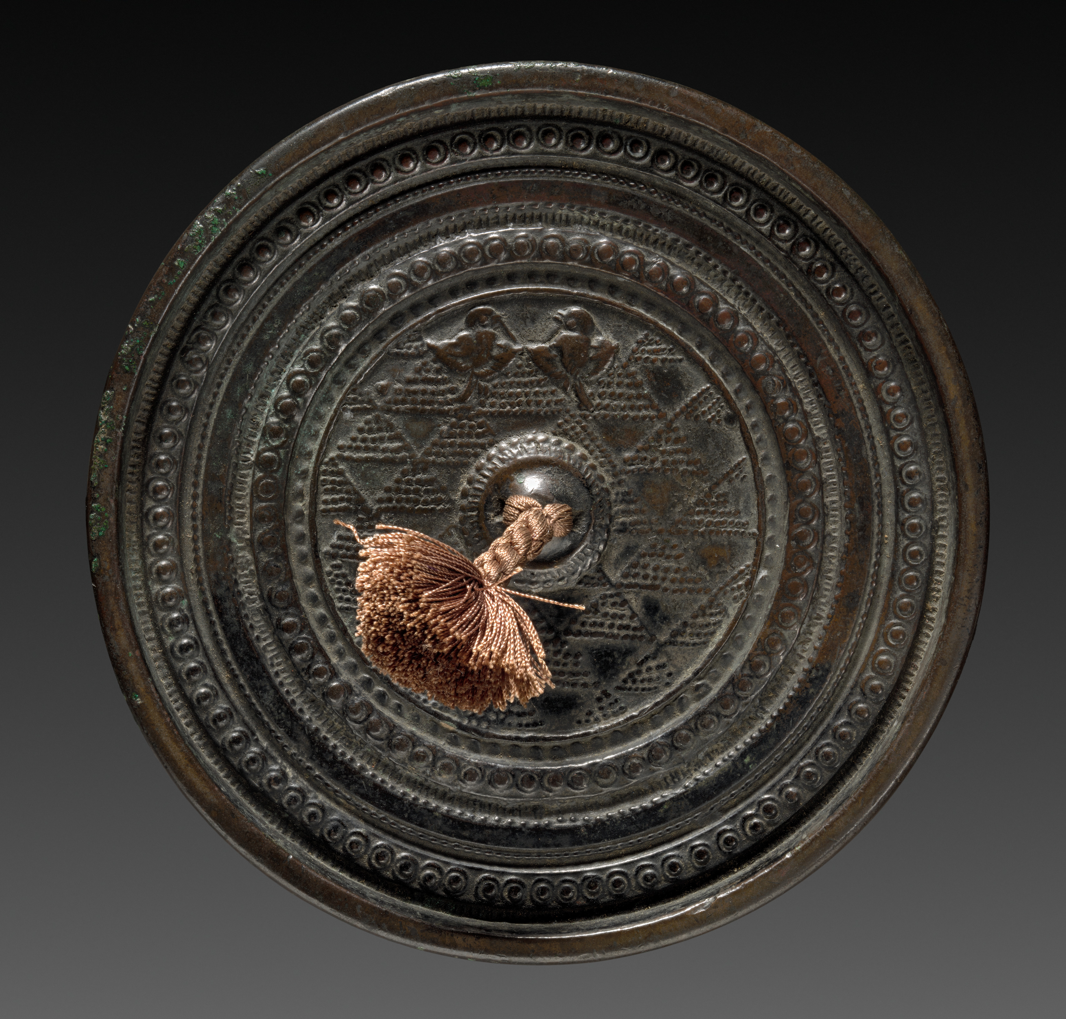 The bronze mirror has a round shape with a dark patina. The front features an etched design consisting of multiple concentric circles. The outer circle is adorned with small, raised dots, and a similar pattern appears in the second circle. A geometric design with a bird on either side appears in the center; the birds face each other. A brown tassel is attached to the mirror's center. The background is dark gray. The artist of this piece is unknown; however, the title is "Mirror".
