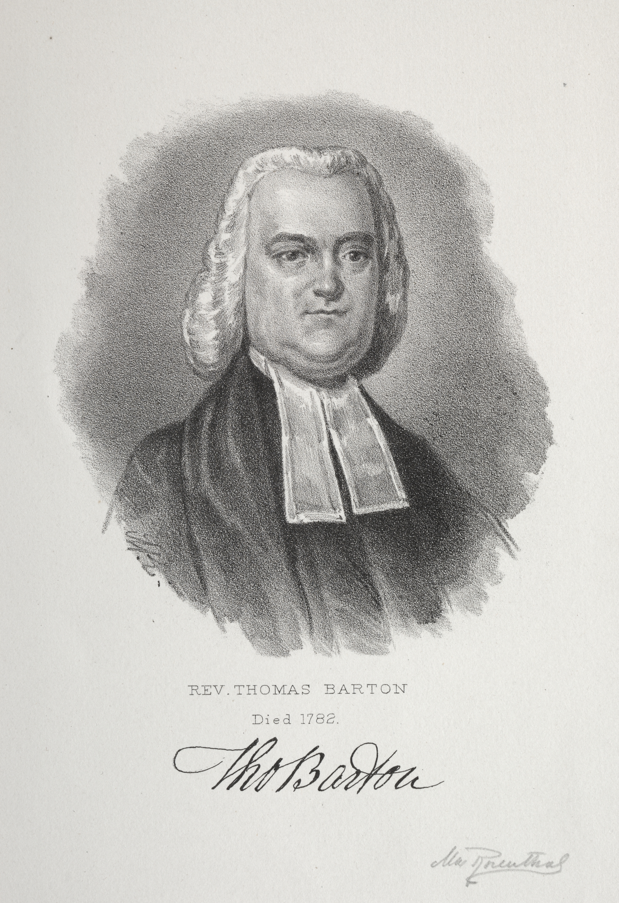 Black and white portrait drawing of a man with shoulder-length wavy hair. The man wears a dark robe with a white neck square. Text below the drawing reads "REV. THOMAS BARTON" and "Died 1782." Below that is what appears to be a facsimile of a signature. In the bottom-right corner is a small signature.
