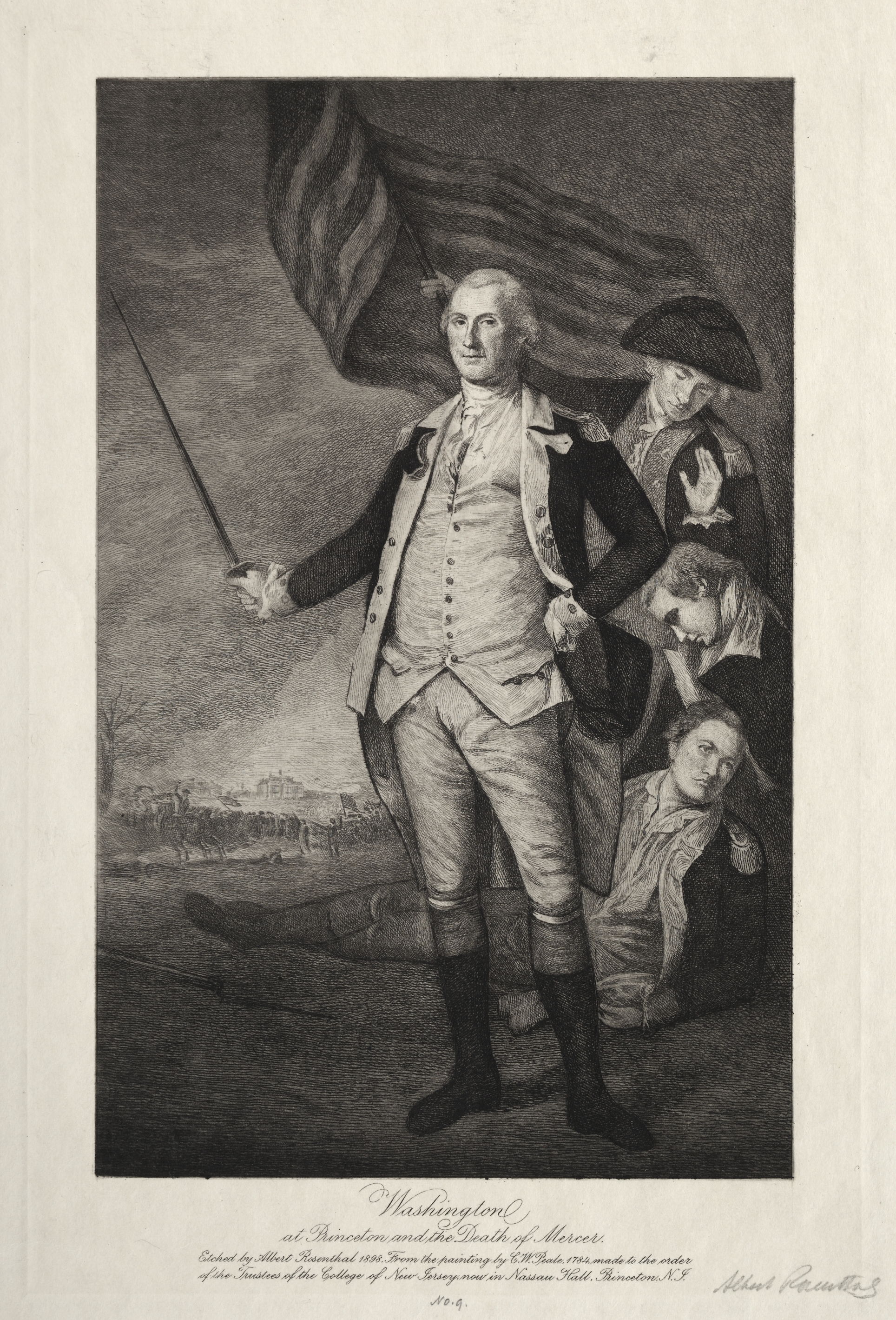 Black and white image. Standing man in 18th-century clothing holding a sword in his right hand. He wears a dark jacket with light-colored vest and pants, and dark boots. He has a light-colored scarf around his neck. Behind him, a man wearing a tricorn hat looks down at another man. The man on the ground wears 18th-century clothing and rests on his left elbow, looking up. In the background, a large flag waves, and there are people and buildings. The scene is set against a dark sky. Title and artist information is written at the bottom.