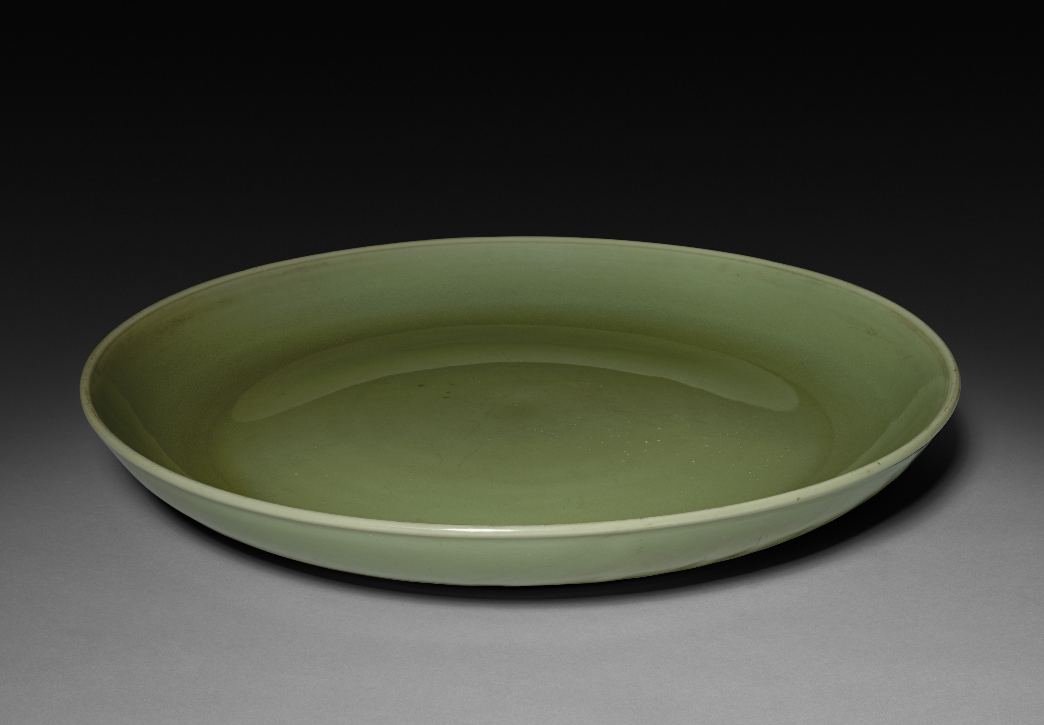 The image shows a light green ceramic plate titled "Platter" by artist unknown. The plate has a flat bottom and sloping sides. The plate is circular with a wide rim and a recessed area in the center. The plate has a glossy finish. The plate is light green in color. The background is dark at the top and gradually lightens to gray towards the bottom. A shadow is cast by the plate onto the surface below it.