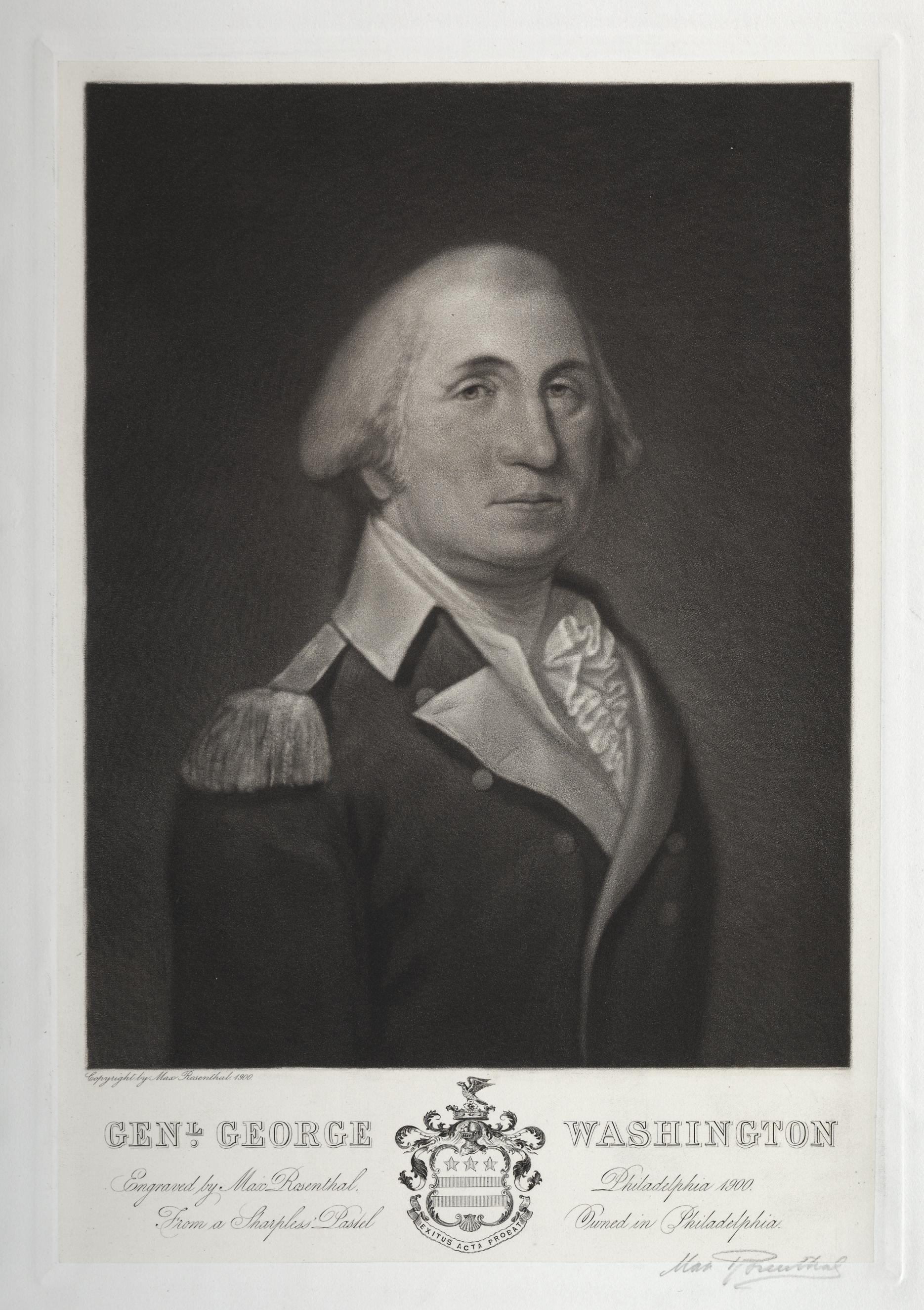 Black and white portrait of a man with short hair wearing a dark military-style jacket with epaulets on the shoulders, a white collar, and a patterned cravat. The man is shown from the chest up, against a dark background. Below the portrait, the text reads "GEN. GEORGE WASHINGTON". Underneath the name is a crest with a shield and foliage. Additional text under and next to the crest reads "Engraved by Max Rosenthal. From a Strohlens Peul. Philadelphia 1880. Proof in Philadelphia". The name "Max Rosenthal" is also written in cursive to the right.