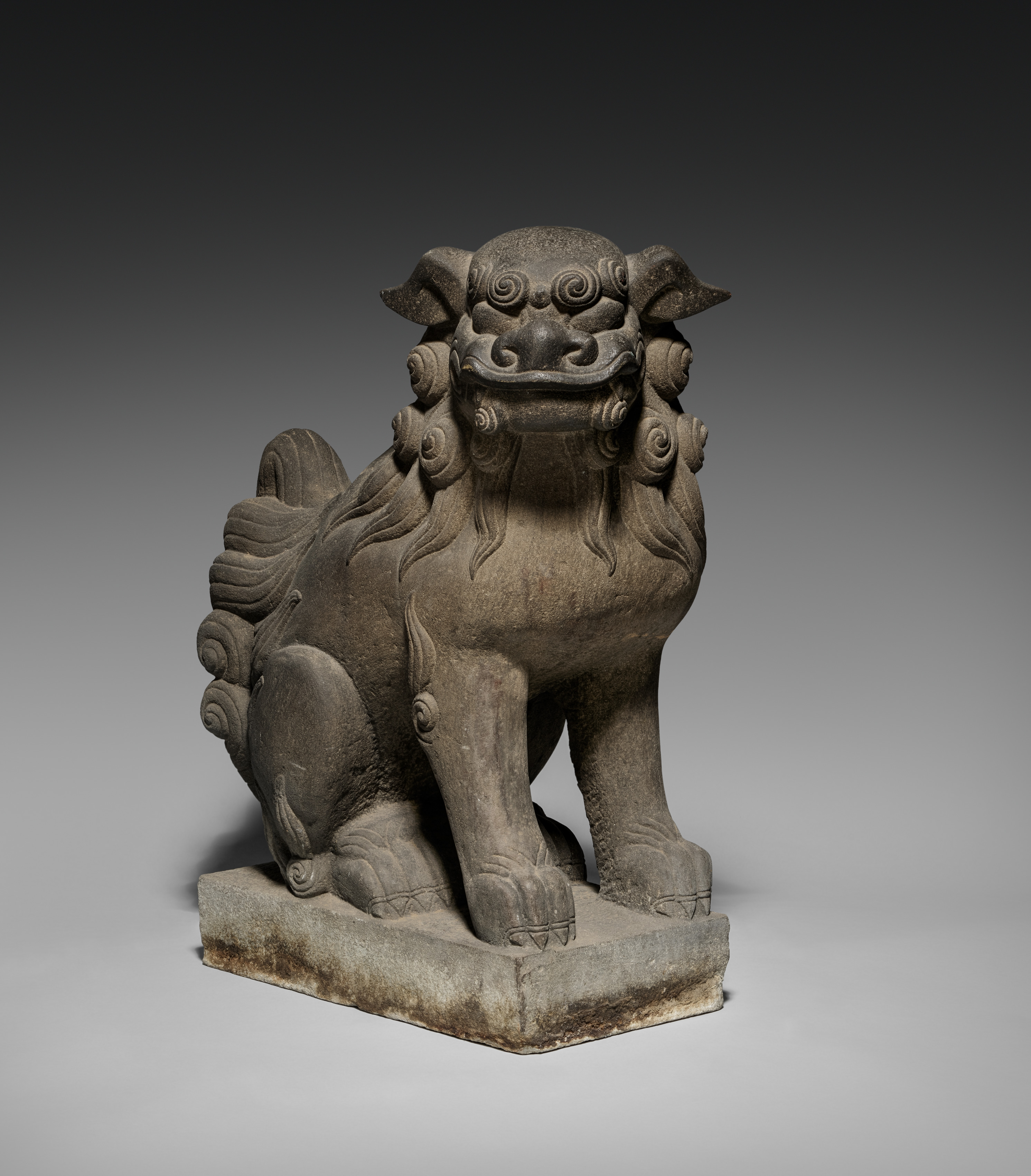 Gray stone sculpture of a mythical lion-like creature. The creature has a large head with a frown and curled mustache-like facial hair on either side of its mouth. Ears are on either side of its head and resemble a leaf. It has a curled mane on its back and around its neck. The front two legs are visible and the back left leg is visible. The sculpture sits on a square base. The background fades from dark gray at the top to light gray at the bottom.
