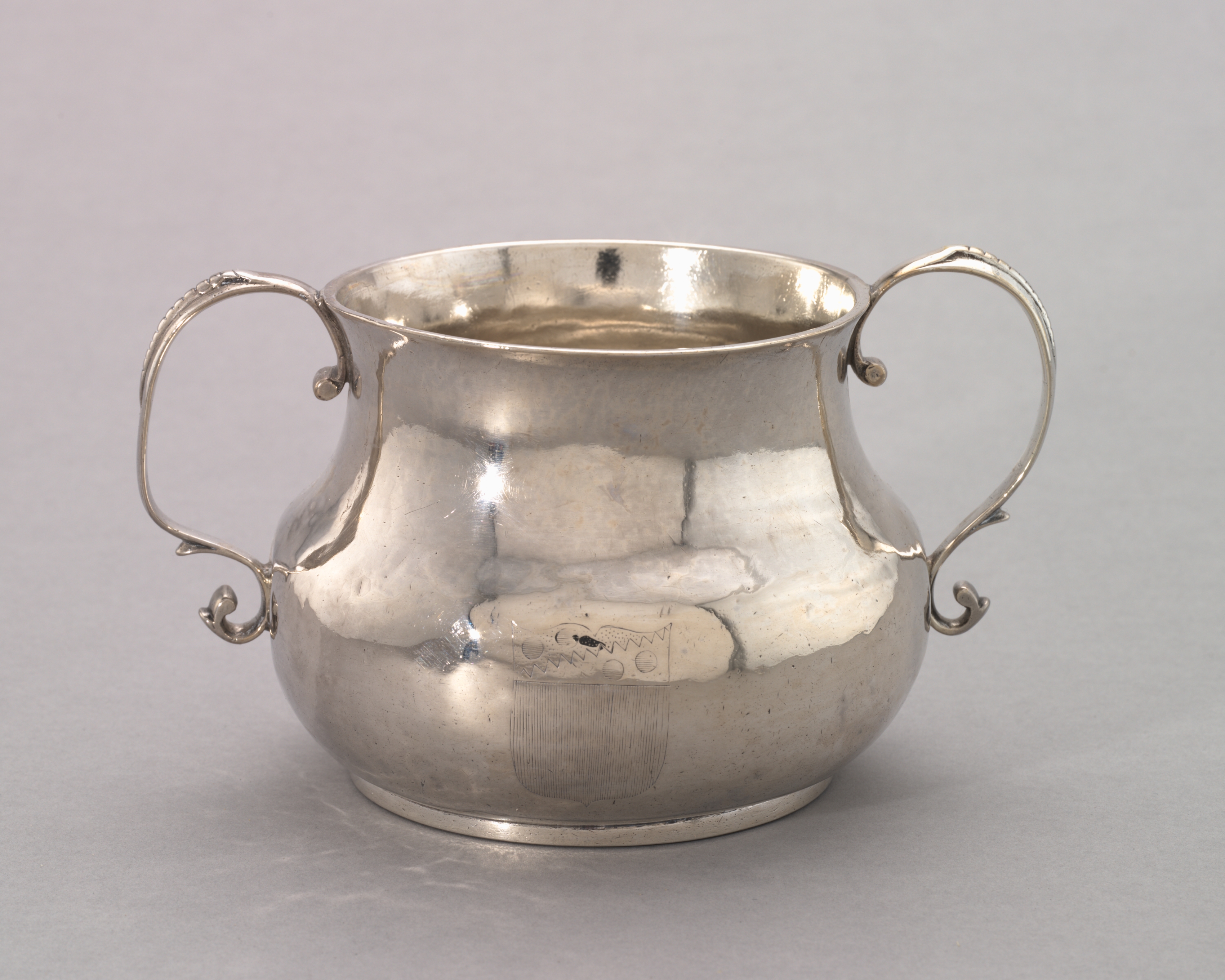 The object is a silver-colored metal cup with two handles. The cup is bulbous with a narrow base and a wide mouth. Two handles are on either side, each made of a single piece of curved metal that extends from the body of the cup, with a decorative scroll-like design at the bottom. The handles are attached to the cup with small metal balls. The surface of the cup is shiny and reflective, with some minor scratches and marks visible. The background is a plain gray color. The cup, a "Two-Handled Cup", is by George Hanners.