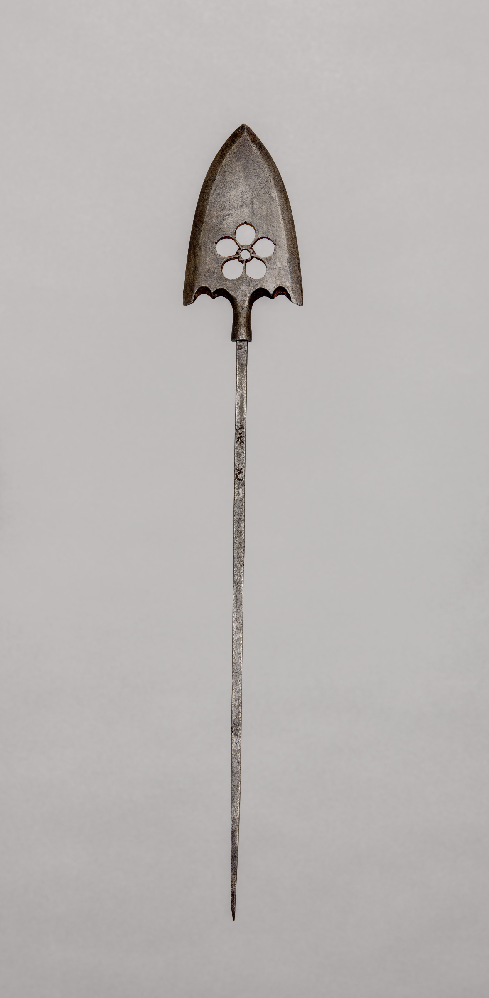 Metal object, resembling a shovel or spade head with a long handle, made of gray metal. The head is triangular, narrowing to a point at the top. The head has a flower-like design cut out of its center. The flower design consists of a circle surrounded by five rounded triangular shapes. The bottom edge of the head has a wavy design. The handle is long and thin, tapering to a point at the bottom. The background is a plain light grey color. The object is titled "Arrow Head" by an unknown artist.