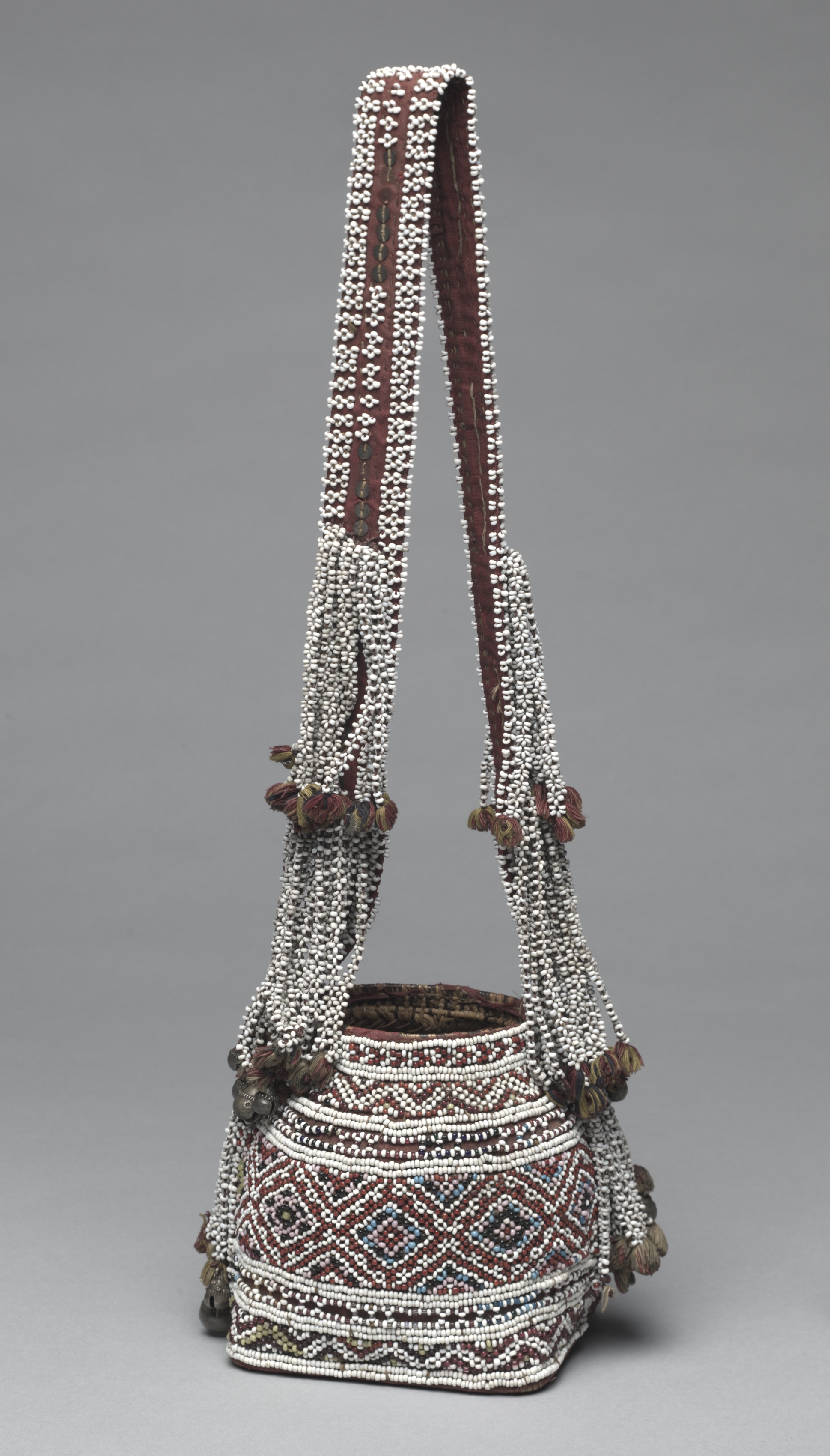 The image shows a basket by a creator. The basket is dark brown with a handle and is decorated with white beads in a geometric pattern. The basket is shaped like a cylinder with rounded edges. The handle is long and thin, made of the same material as the basket, and is adorned with white beads. The background of the image is gray. The basket has a decorative edge with tassels. The beads form a pattern of lines, diamonds, and other shapes. The basket appears to be made of woven material.
