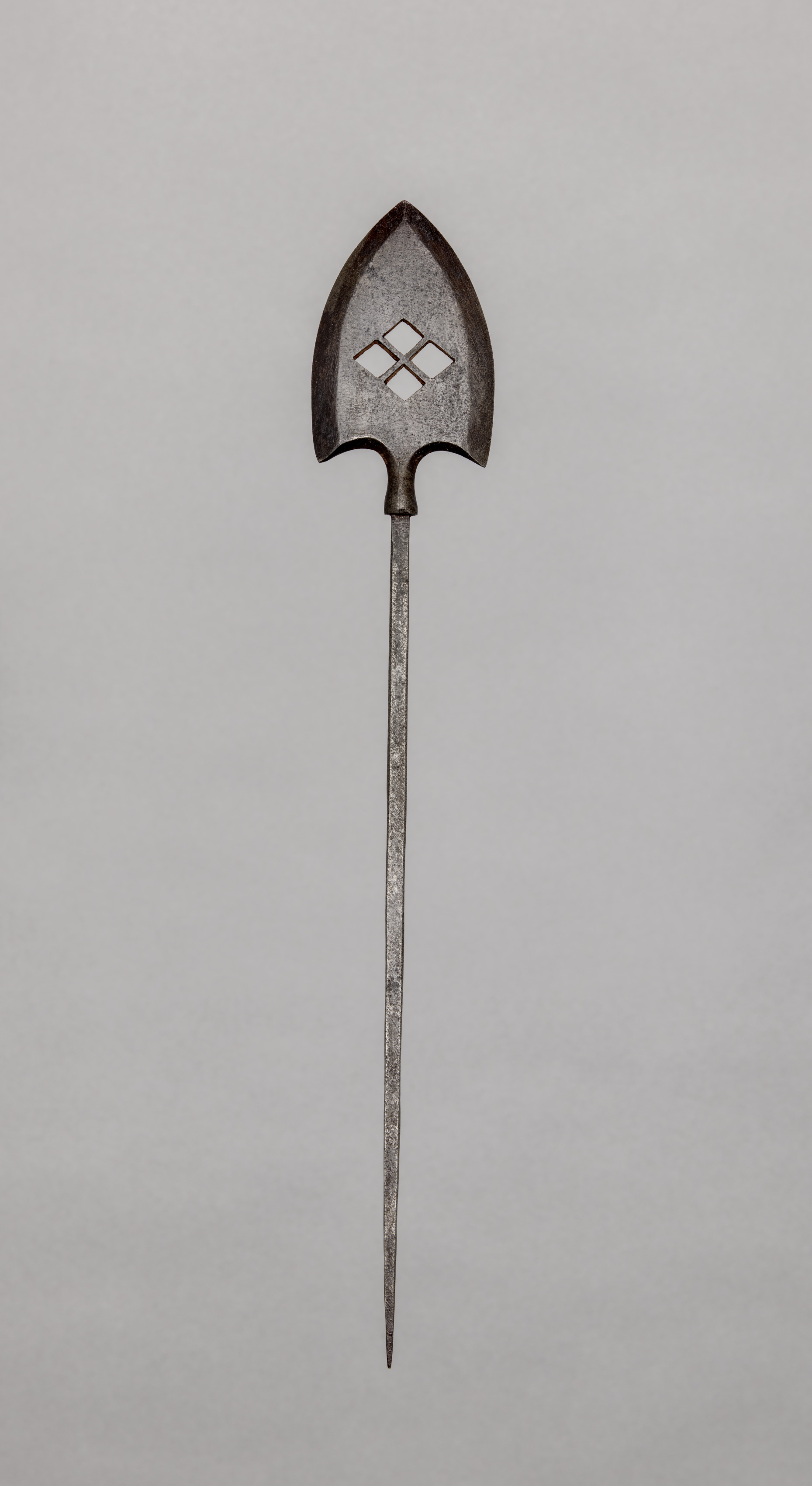 The image depicts a metal object with a long, thin shaft ending in a sharp point, and a broad, flat head resembling an arrowhead. The head features a distinctive teardrop shape with a diamond-shaped cutout at its center. The object's surface exhibits a grayish hue with darker edges and a textured appearance. The background of the image is a plain gray color. The object "Arrow Head" by the artist is shown against a neutral background.