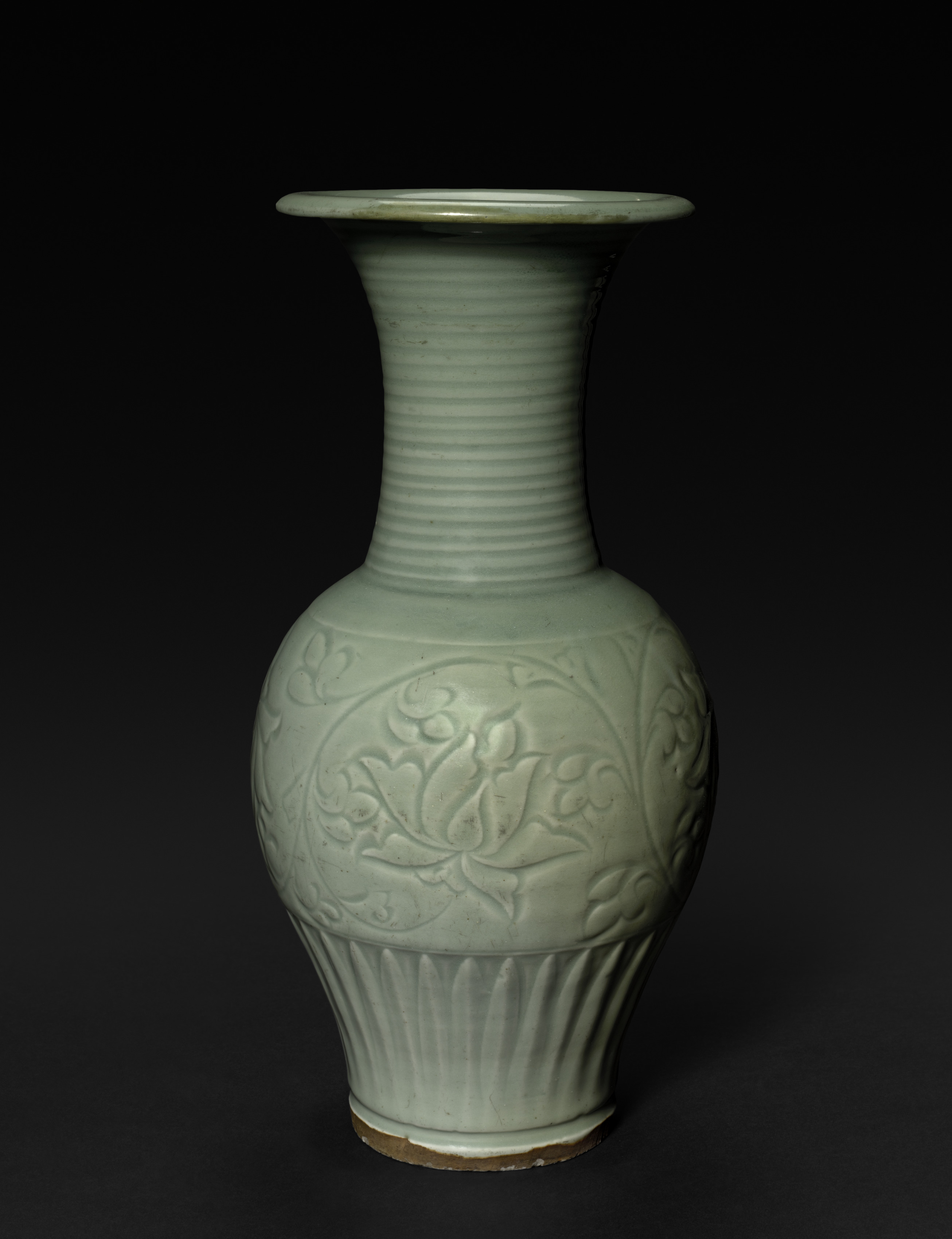 The vase is a light green color with a wide mouth and a narrow neck. It has a ribbed pattern around the neck. The body of the vase is bulbous with a carved floral design. There are vertical ridges on the lower portion of the vase. The base of the vase is not glazed, showing a brown color. The background of the image is black. The vase appears to be a type of Celadon Ware.