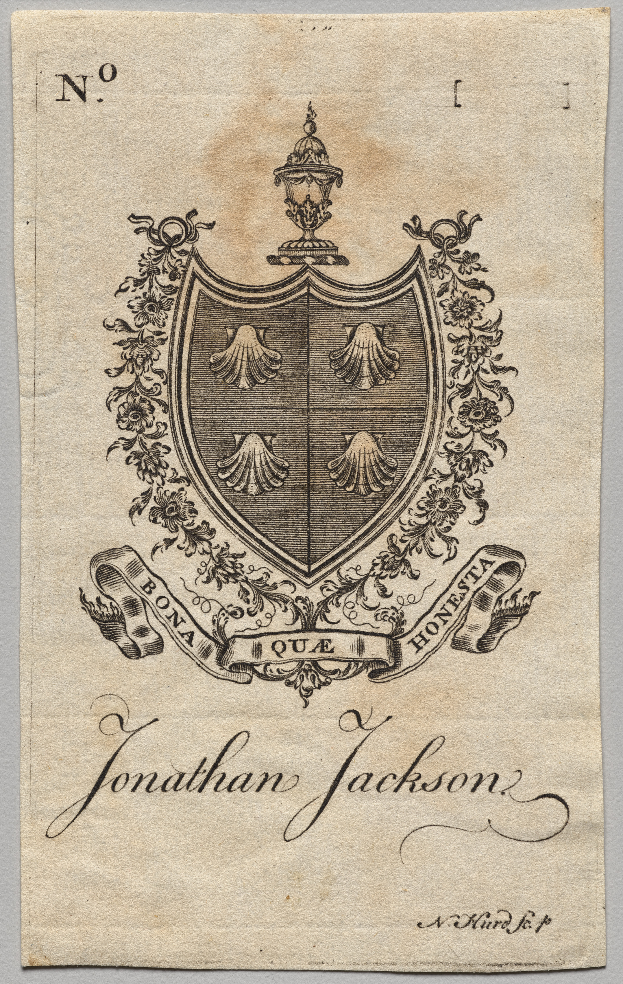 Tan-colored aged paper with darker tan and brown spots. A shield with a pointed bottom and curved top. The shield is divided into four sections by one vertical and one horizontal line. Each section contains a shell. A lamp post sits on top of the shield. The shield is surrounded by curvy foliage and flowers, on both sides. A banner wrapped around the bottom of the foliage contains the words "Bona", "Que", and "Honesta". The name "Jonathan Jackson" written in black cursive across the bottom. The initials "N. Hurd" and cursive letters underneath in bottom right corner. " No " and a number 0 in the top left corner; brackets in the top center.