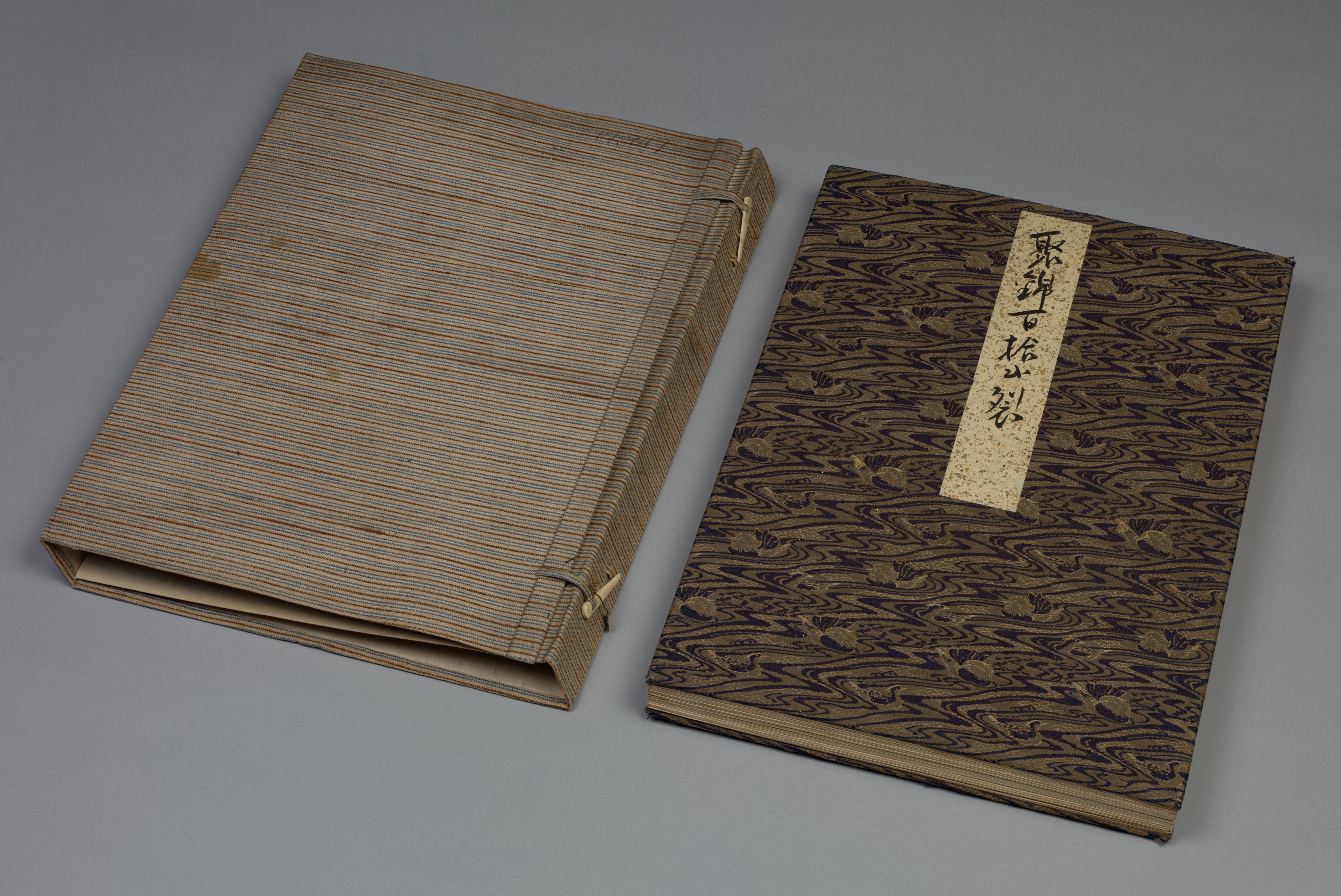 Brown book with thin stripes on cover lies open on left with beige ties, right book has brown wood grain patterned cover with a tan label and black writing on it. Title: Album of Textile Samples Artist: unknown