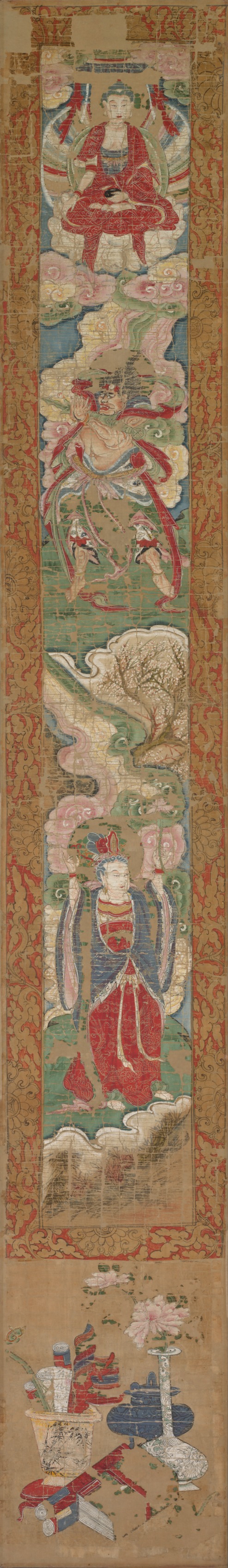 Vertical rectangular panel with a gold border featuring red designs. The panel is divided into three main sections. The top section depicts a figure in red robes sitting cross-legged on a lotus flower, surrounded by blue and green clouds and pink and green outer robes. The middle section shows a figure in red and blue robes standing on a cloud, with green and pink background. The bottom section contains a collection of objects, including a blue and white vase with a pink flower, several books stacked in a red and blue box, and other items including a white conch shell. The panel's background is primarily tan. The title is "Buddhist Panel" and the artist is unknown.