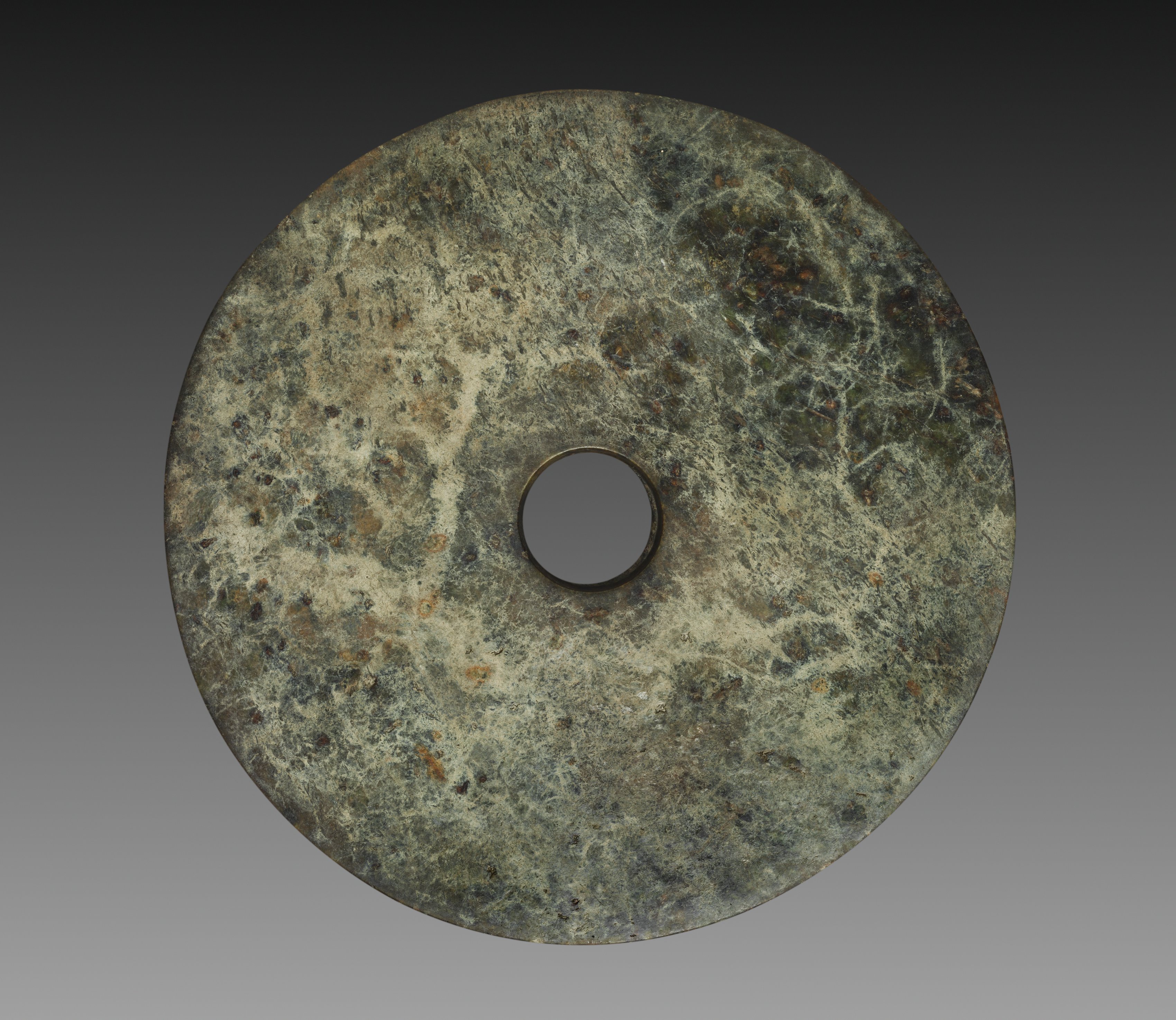 The Ceremonial Disc (Bi) by unknown artist is a circular stone object with a hole in the center. The disc is flat and has a mottled appearance with shades of green, gray, and brown. The surface of the disc is marked with cracks and imperfections. The hole in the center is circular and appears to be a darker gray color than the rest of the disc. The background behind the disc is a gradient that transitions from dark gray at the top to light gray at the bottom.