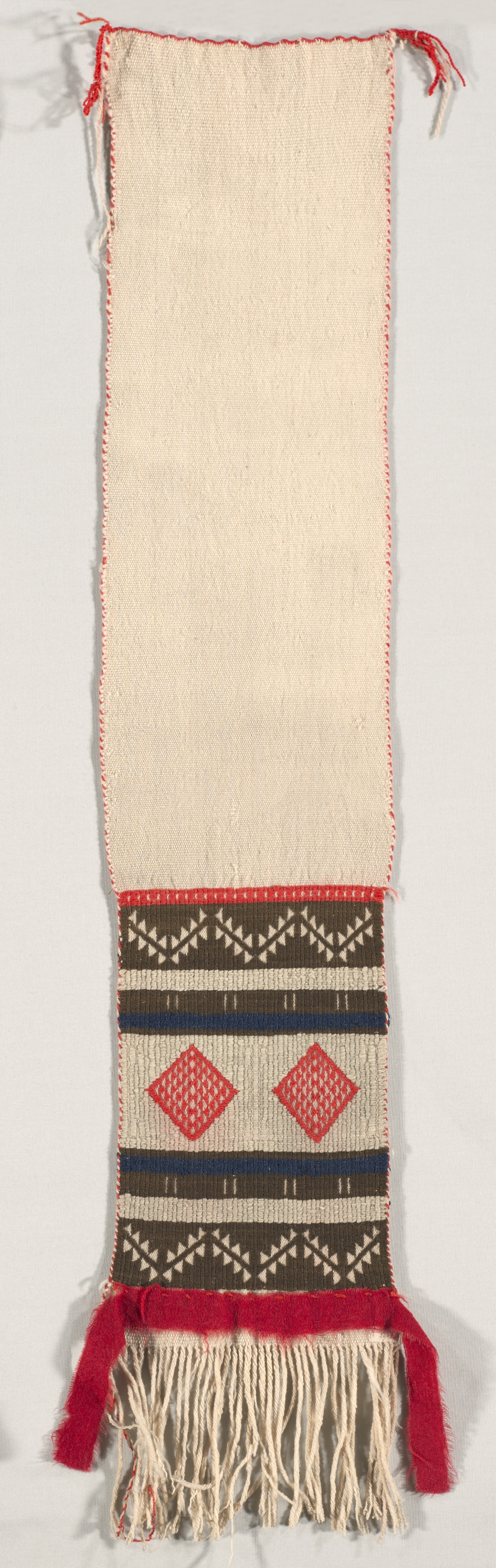 Long, narrow, off-white woven textile with a red and white stitched border on the edges. The top portion is plain off-white. The bottom portion features a pattern of horizontal stripes in red, dark blue, light beige, and dark brown. Two red diamonds are centered on a beige background with a dark brown and red border. The diamonds are surrounded by beige and dark brown geometric patterns. The bottom edge has long off-white and red fringes. Tassels are at the top corners. The textile is likely a Hopi Brocade Style Dance Sash.