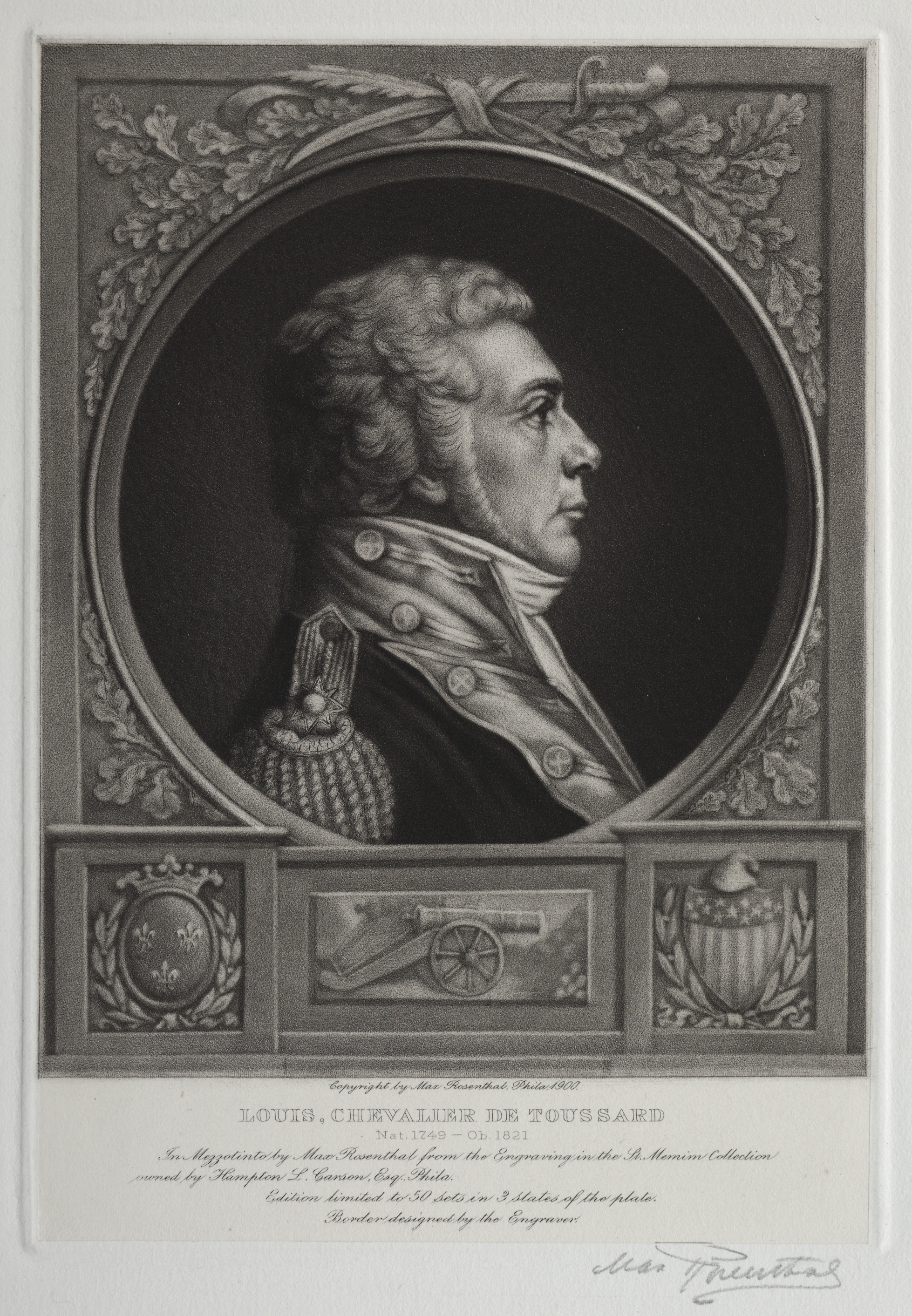 Black and white portrait of a man with short curly hair wearing a military uniform with epaulets and a high collar, turned to the right. The portrait is within a circular frame and is surrounded by a square ornate frame with leaves and a ribbon at the top. Below the portrait are three small rectangular panels. The center panel depicts a cannon. The left panel has a fleur-de-lis in an oval frame. The right panel depicts a shield with 13 stripes and a star above. The image includes text identifying the subject as Louis, Chevalier de Toussard.