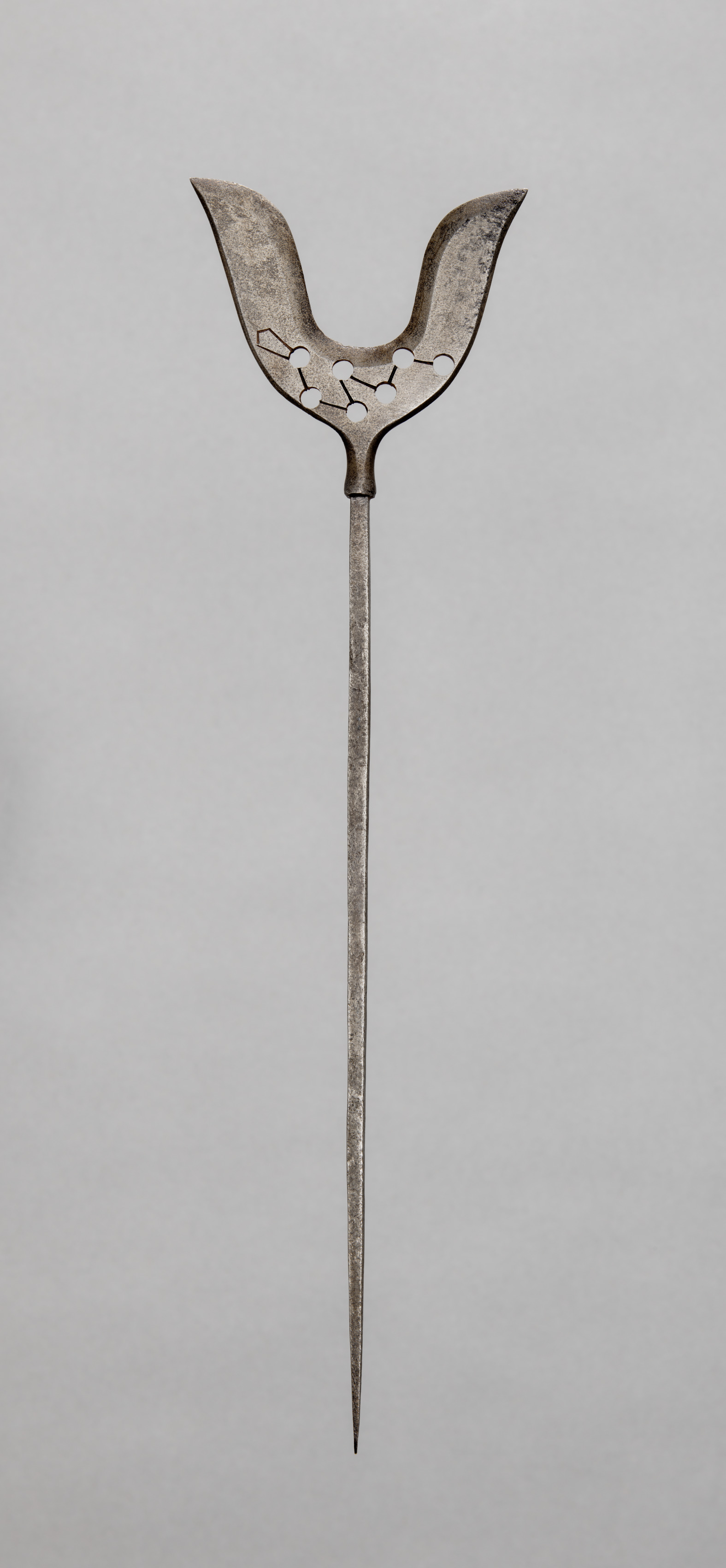 Metal object with a long, thin shaft and a wide, forked end. The forked end has two curved prongs with a decorative design in the center. The object appears to be made of a weathered metal. The background is a plain gray color. The object is titled "Arrow Head" by an unknown artist.