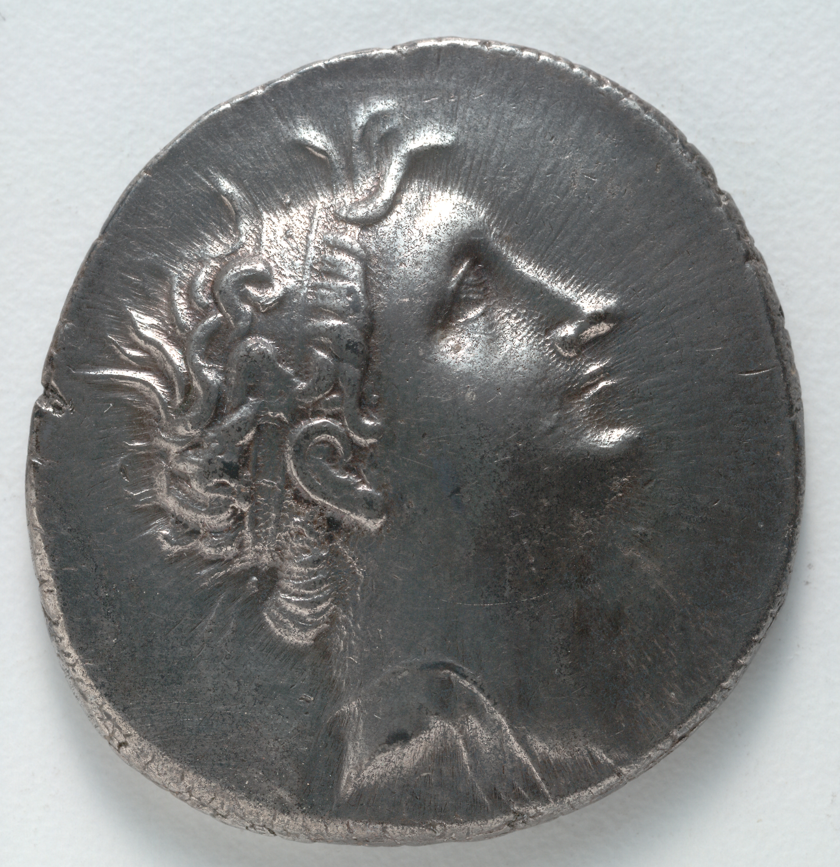 Silver coin with a raised profile portrait of a man with long wavy hair facing right. The man's hair has a center part and a distinct wave pattern. He appears to have a beard. The coin has a rough edge and a scratched surface.