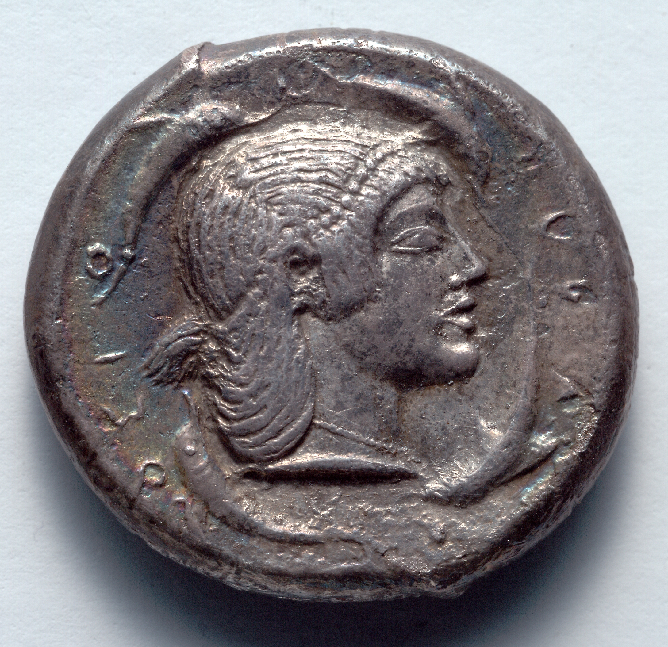 Tetradrachm: Head of Artemis/Arethousa, dolphins (reverse)