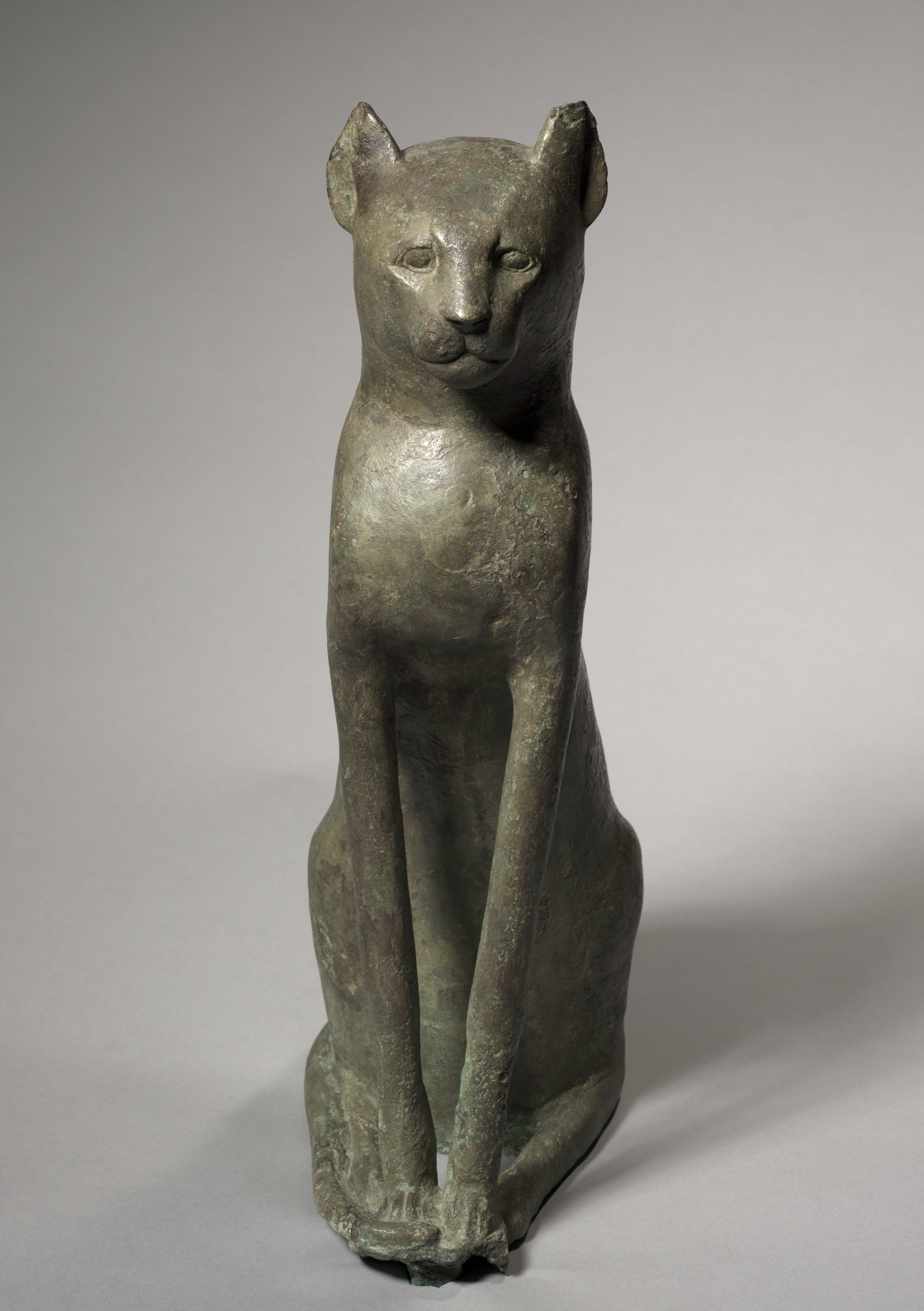 The Cat Coffin by an unknown artist depicts a bronze sculpture of a cat. The cat sits upright with its head held high, facing forward but slightly to the right. Its body is slender with long legs folded under its body. The cat's ears are pointed upwards and slightly back. Eyes and nose are present. The bronze has a green patina. The background is a plain gray color with a shadow cast to the right.