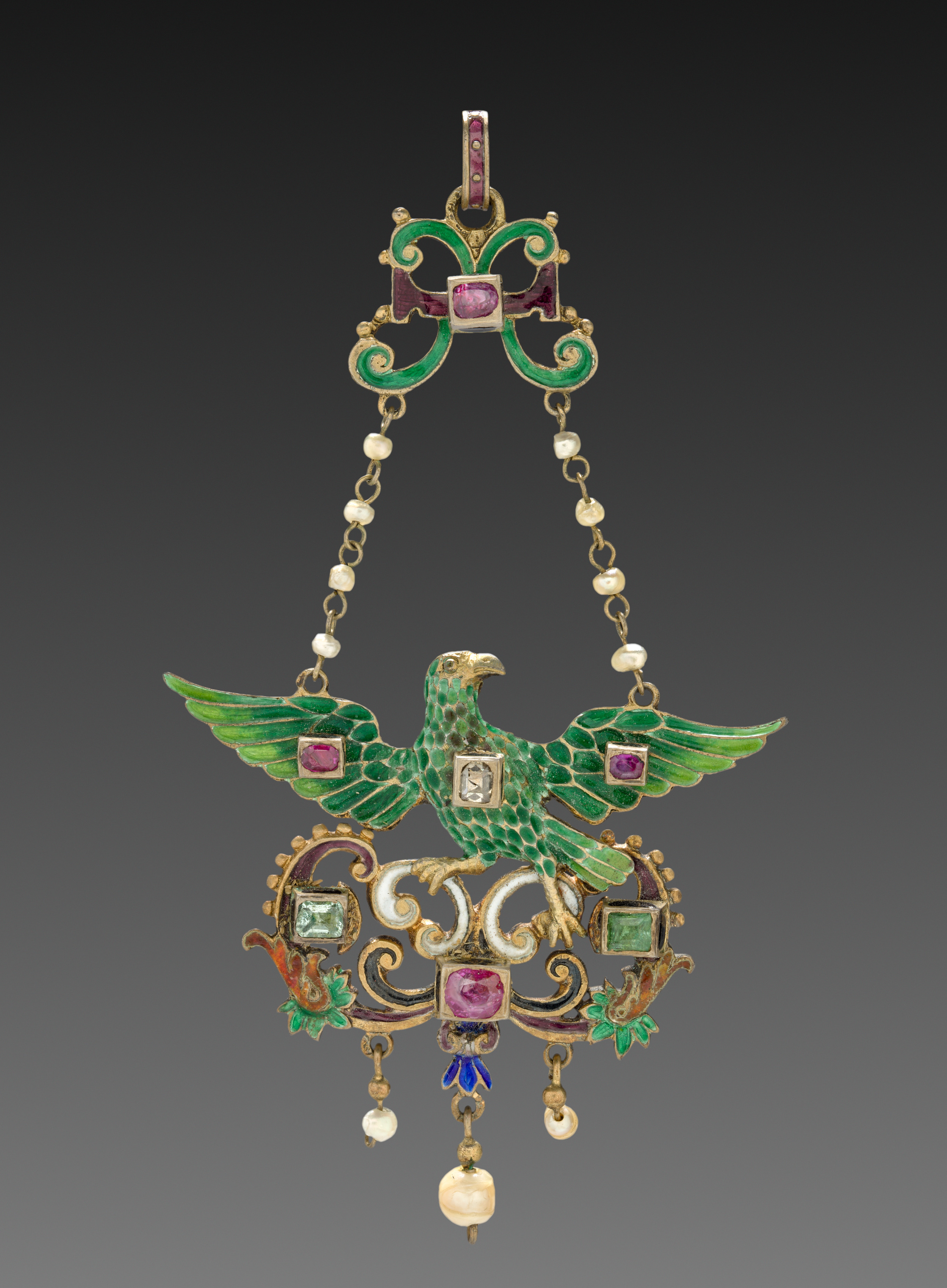 Gold pendant in the shape of a bird with outstretched wings. The bird's body is green with square-cut pink, green, and clear stones for eyes and on wings. A gold chain with white beads attaches to top of pendant. The bird sits on a gold scrollwork with square-cut pink and green stones, and pearls and blue stone dangling below. A green and pink stone design is at top of pendant.