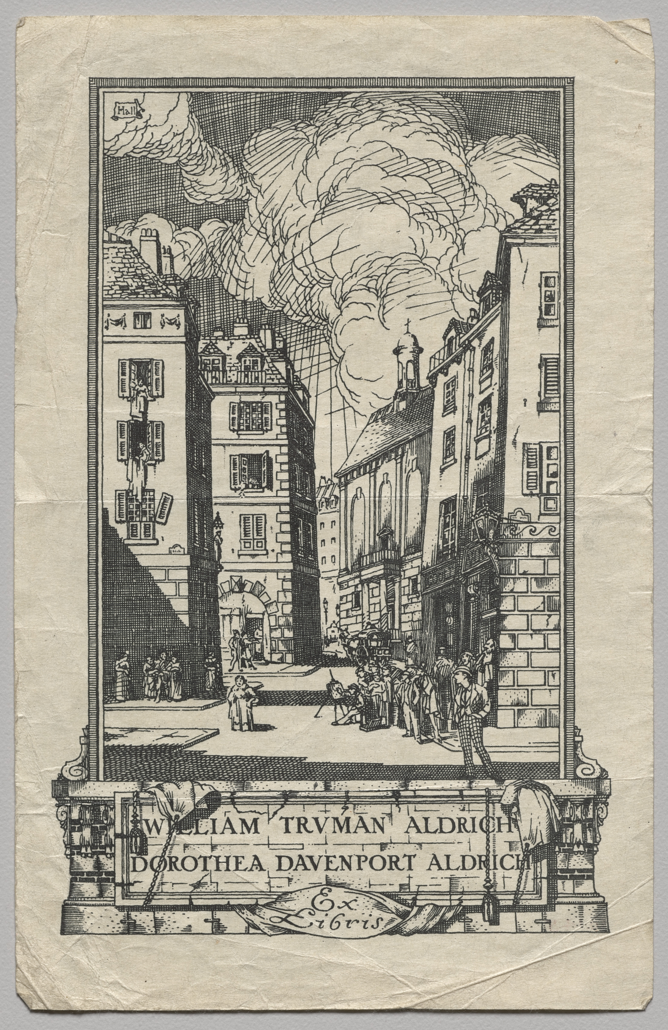 Black and white drawing of a street scene. The scene depicts a street with buildings on either side. The buildings have multiple stories, with windows and shutters on each floor. The leftmost building is taller than the other buildings. There are people standing on the street, some near a horse-drawn vehicle. The sky has a large cloud formation emanating from between the buildings. The drawing is in a rectangular frame with a decorative border. The frame sits on a stone-like base with the names "William Truman Aldrich" and "Dorothea Davenport Aldrich" engraved on it. The base also has the words "Ex Libris" engraved on it, accompanied by an oval shape. The entire image is on a piece of aged, off-white paper with visible creases and wear.