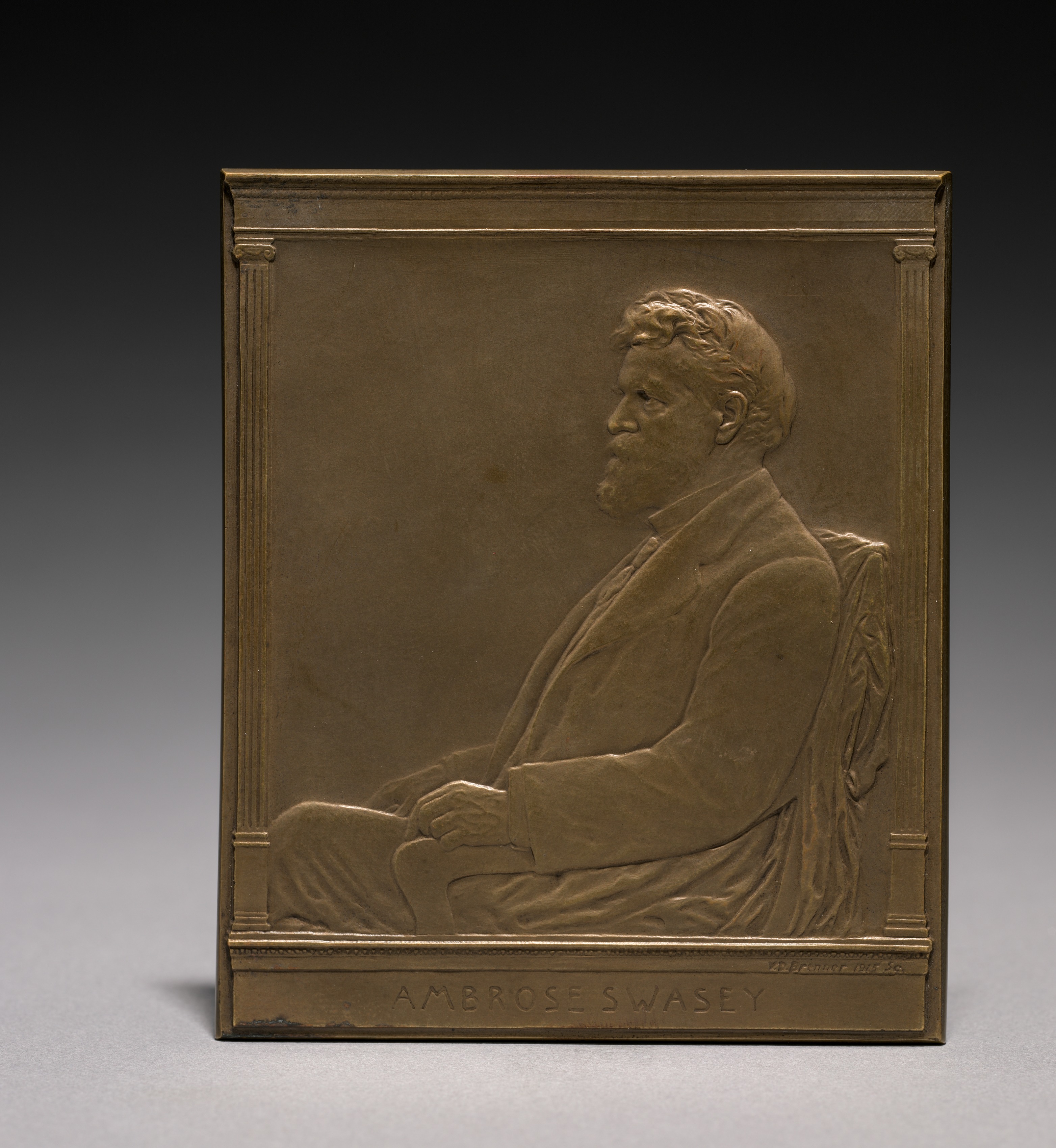 Bronze plaque with a raised relief portrait of a man with short hair wearing a suit sitting in a chair. The man faces left. He has both hands in his lap. A decorative border surrounds the portrait. The name "AMBROSE SWASEY" is engraved at the bottom. The background of the plaque is flat and smooth. The plaque sits on a gray surface with a black-to-gray gradient background.