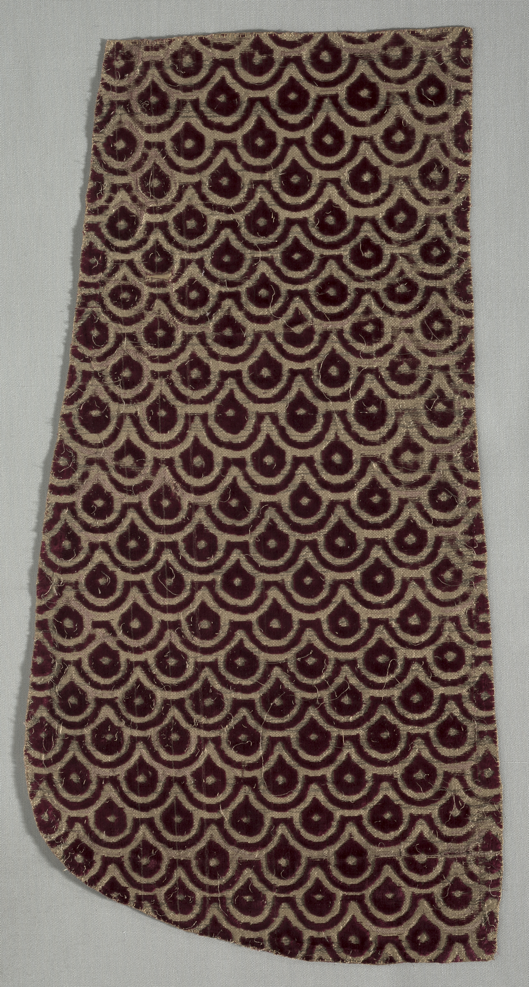 Fragment of a Chasuble by Unknown. A piece of fabric with a repeating pattern is shown. The fabric is primarily tan with a maroon design. The design consists of teardrop shapes with the pointed end down. The teardrops are outlined in tan and have a maroon interior. The teardrops are arranged in rows that alternate in orientation. The fabric is rectangular but has a curved bottom left corner. The fabric is on a light gray background.