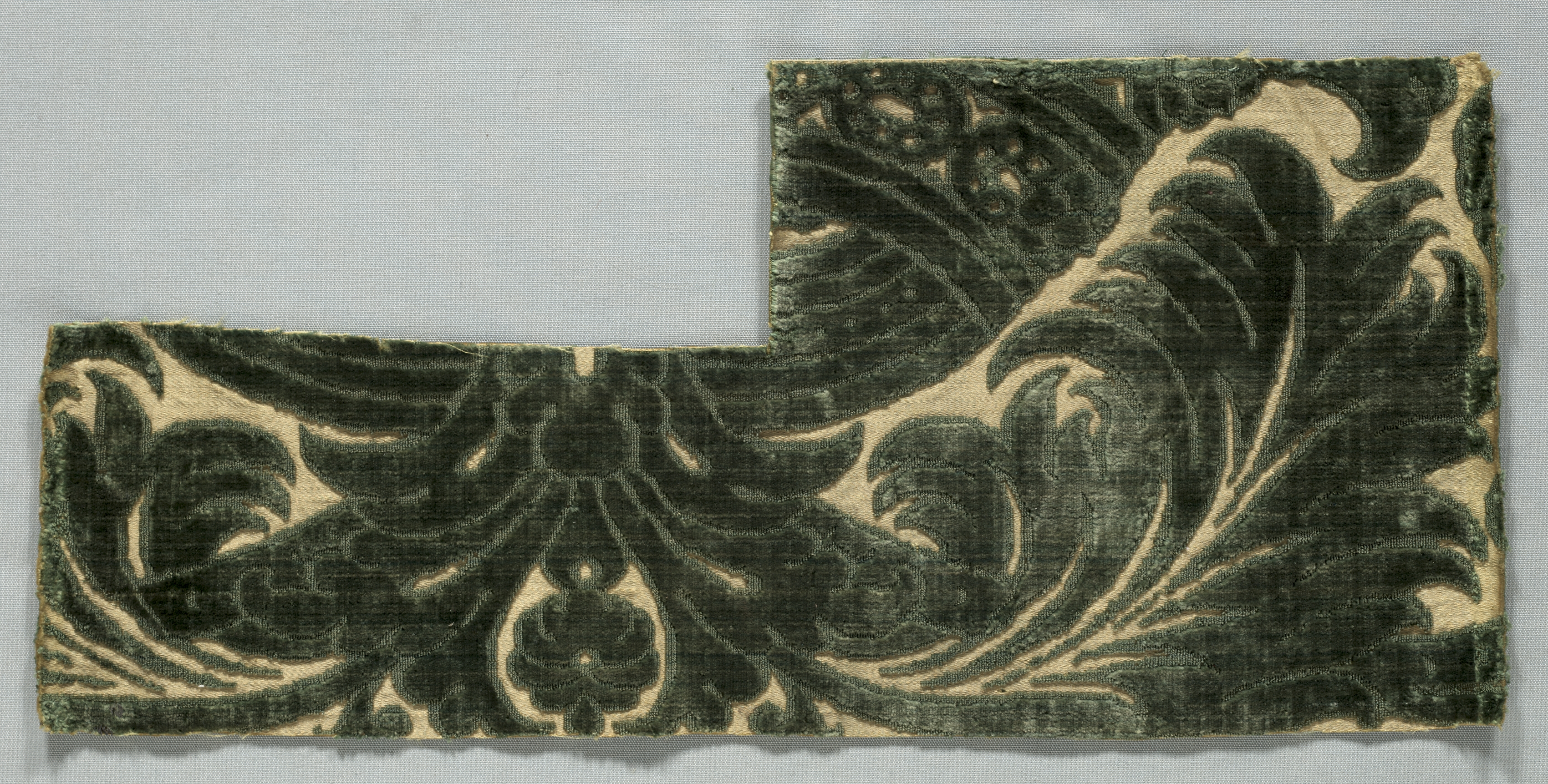 The image depicts a velvet fabric fragment titled "Velvet Fragment" by an unknown artist. The fabric is dark green with a floral pattern in a lighter beige color. The fabric is cut into an L-shape, with the top right corner bent down to form the L. The fabric has a rough, frayed edge around its perimeter. The background of the image is a light gray color. The fabric appears to be an antique or vintage piece, with a classic floral design. The fabric is displayed on a flat surface, with no other objects or features visible. The overall appearance of the fabric suggests it may be a sample or remnant from a larger textile.