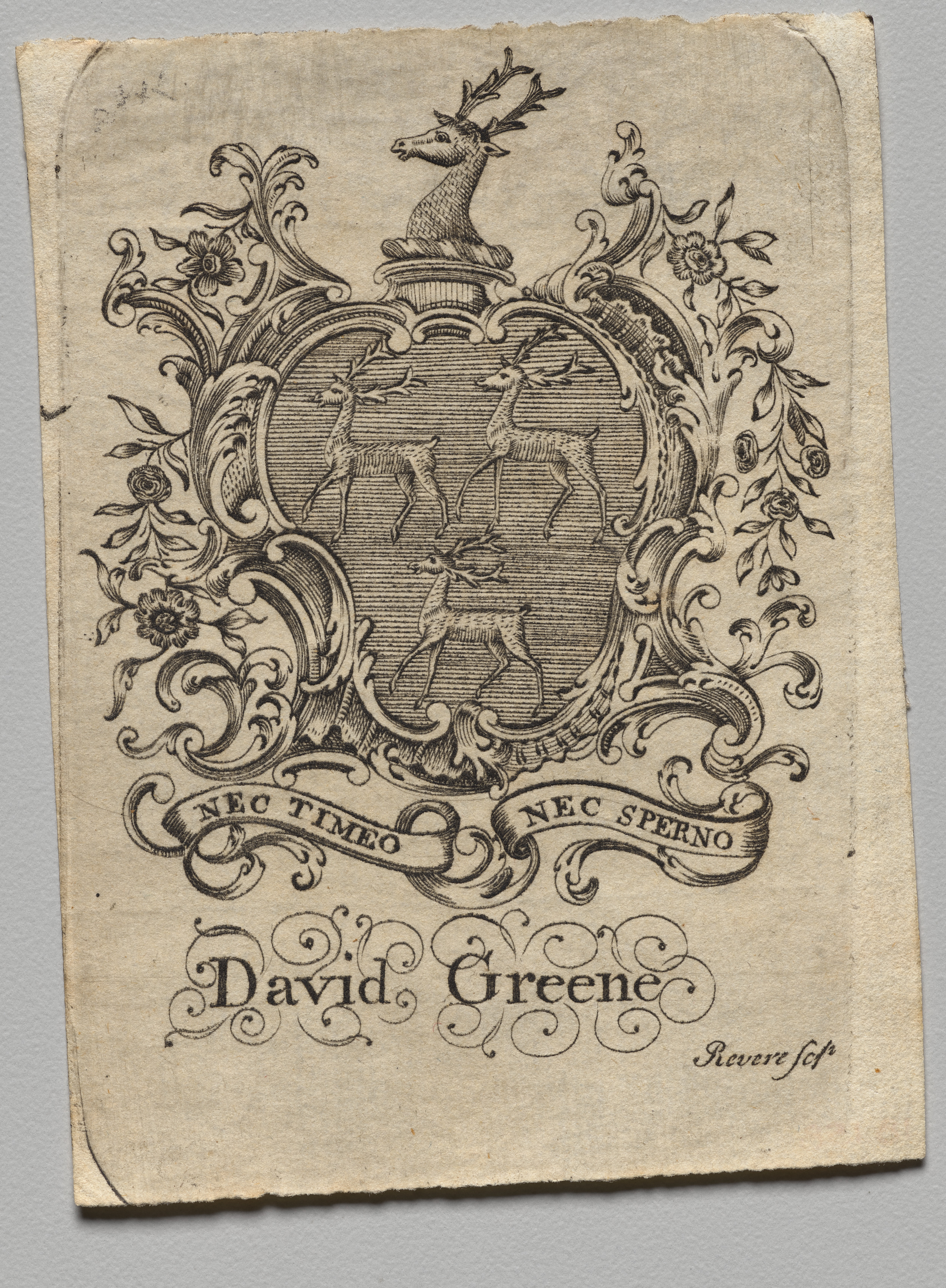 Bookplate with a coat of arms. The coat of arms has a crest with a deer head. Inside the shield on the coat of arms are two deer. The shield on the coat of arms is surrounded by ornate designs and foliage. There is a ribbon below the shield with 'nec timeo nec sperno' written on it. The name 'David Greene' is written below the shield. The bottom right has 'Revere fct' written in small cursive text. The bookplate has an aged appearance.