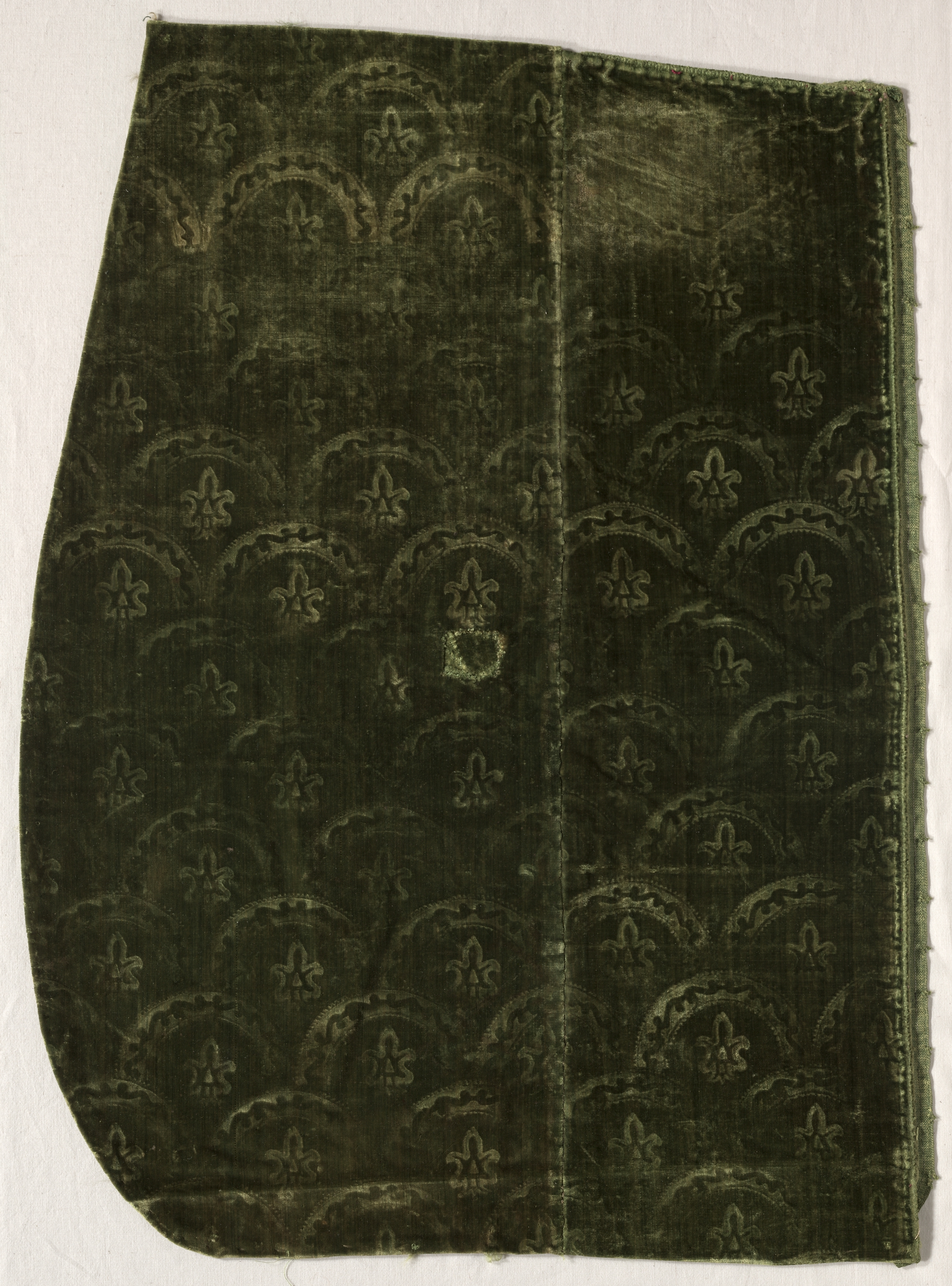 Dark green velvet fabric with a repeating pattern of fleur-de-lis motifs in a curved arch shape; fabric has a smooth, plush pile and a subtle sheen; edges are rough and unfinished; fabric is folded in half vertically down the center; background is off-white. Fragment of Stamped Velvet.