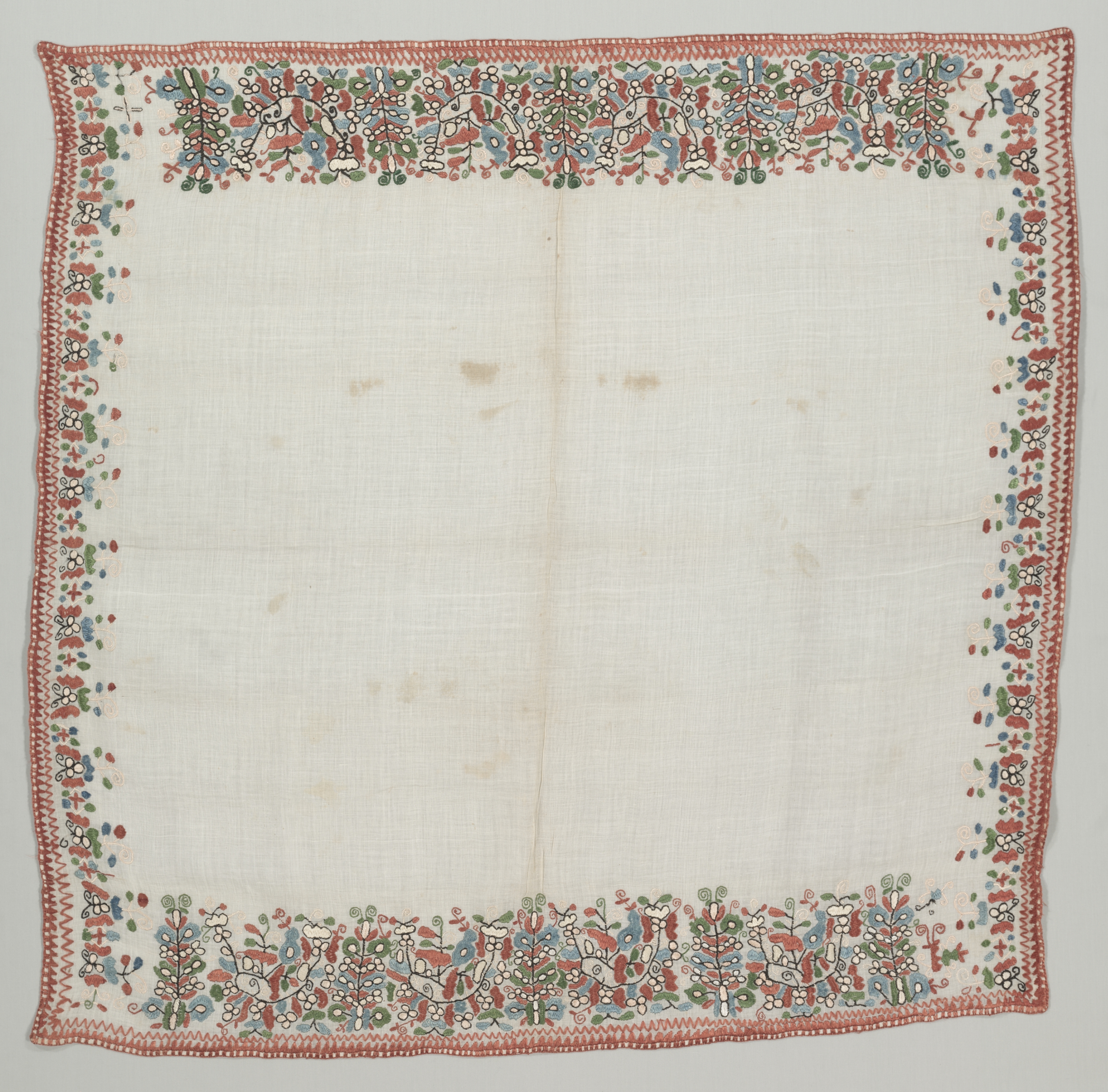 The cloth "Headcloth" by the artist is square-shaped. The main body of the cloth is off-white with some brown stains. The border of the cloth features a red and white zigzag pattern on the outside edge. Inside this, there is a floral pattern in blue, green, and red. The floral pattern is present on all four sides. The top and bottom sides have a wider floral pattern section, while the left and right sides have a narrower floral pattern section.
