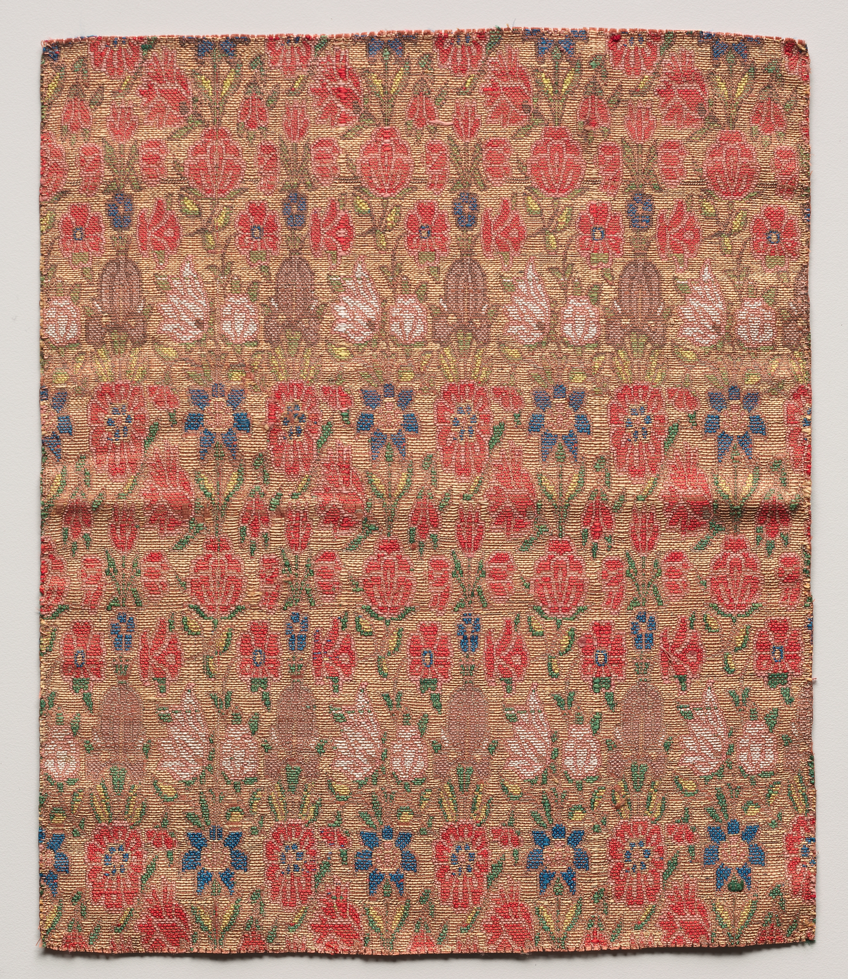 The artwork, titled "Fragment" by an unknown artist, depicts a fabric with a floral pattern. The fabric is square and features a repeating design of red, pink, blue, and white flowers with green leaves on a tan background. The flowers are arranged in rows, with each row featuring a different pattern. The fabric appears to be made of a woven material, possibly silk or cotton, and has a slightly worn and frayed edge. The background behind the fabric is a plain light gray color.