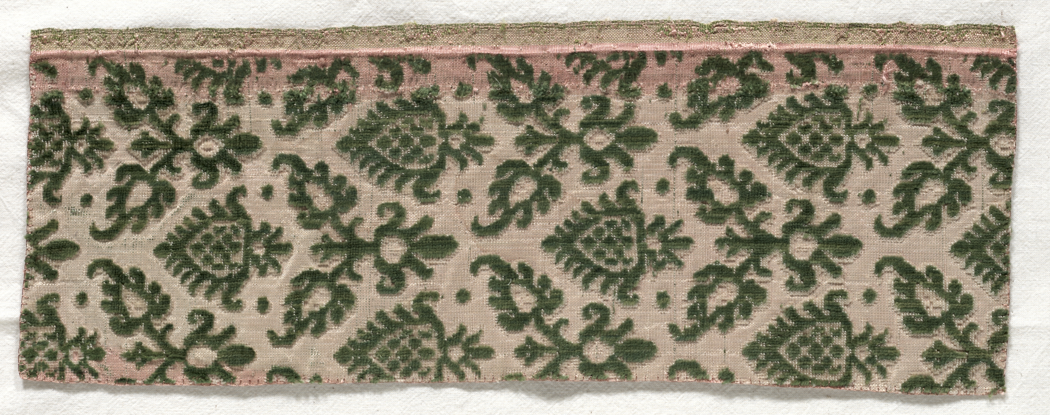 Velvet Fragment, rectangular piece of fabric with green floral patterns on a beige background, top edge has pink satin and gold trim, fabric appears to be velvet. the green patterns are symmetrical and include flowers. there are no visible signatures or markings. the background behind the fabric is white.