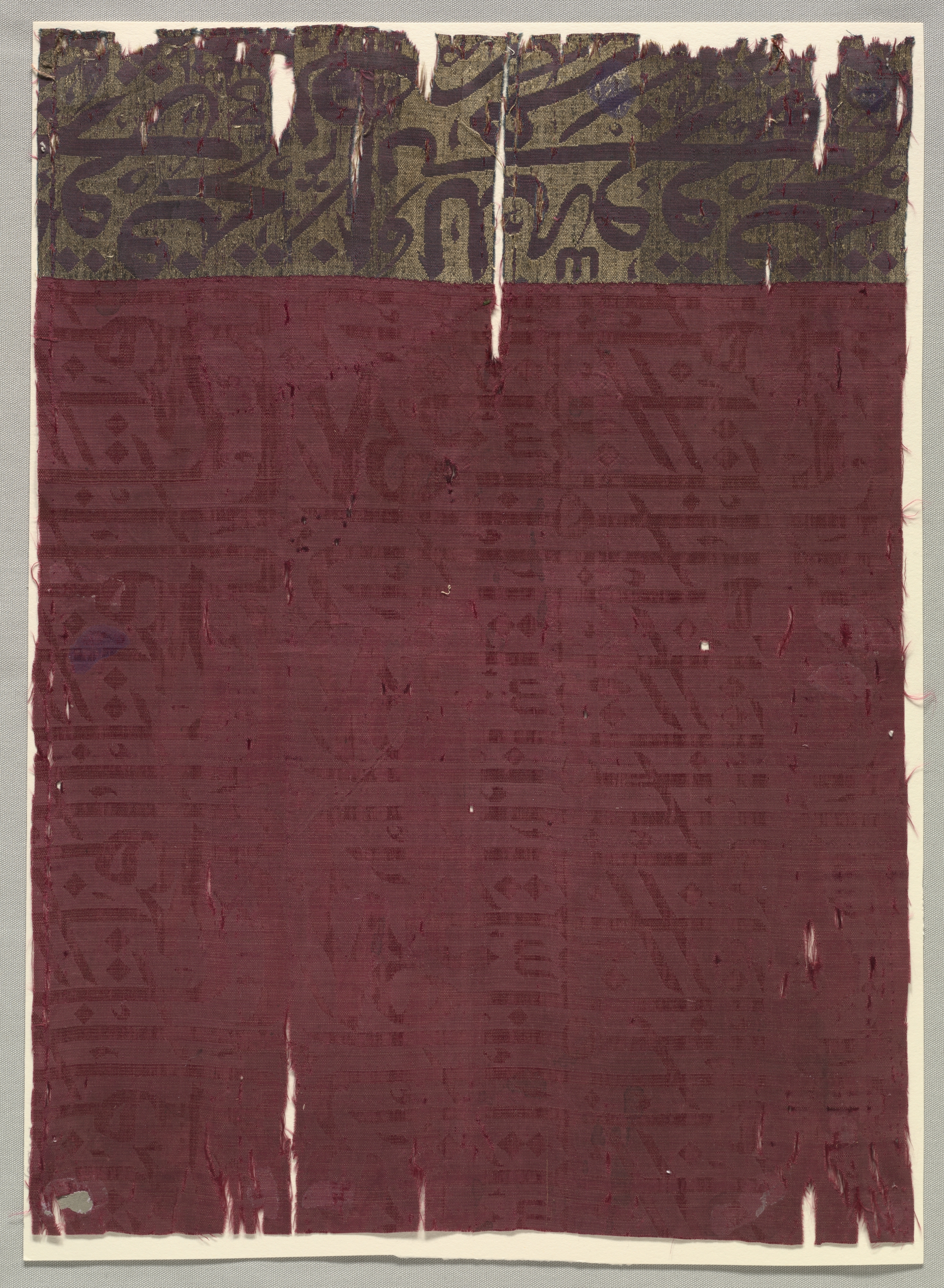 The textile fragment by artist unknown is a vertically oriented, rectangular piece of fabric, likely silk, divided into two horizontal sections. The top section is green with a pattern of black Arabic calligraphy and tear-damaged edges. The bottom section is maroon with a lighter maroon geometric pattern. The fabric appears to have frayed and torn edges. The piece is mounted on a light gray background with a beige border around the edges.
