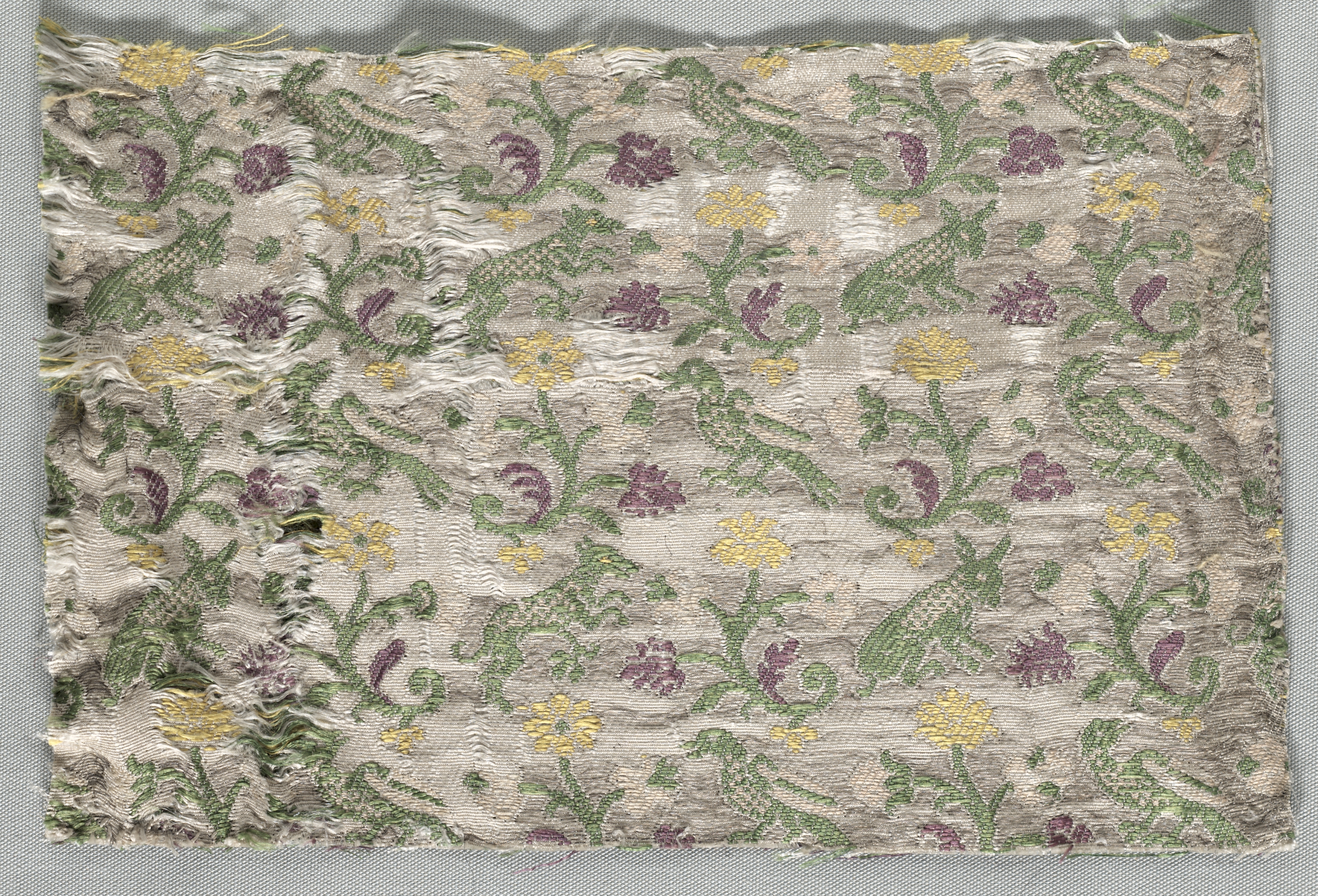 The textile fragment, by an unknown artist, is a square piece of fabric with frayed edges. The fabric has a predominantly white background and features a repeating pattern of green vines, yellow flowers, and purple shapes. The fabric appears to be made of a rough, woven material with visible texture. The background behind the fabric appears to be a light-colored fabric or paper with a slightly textured surface. The edges of the fabric are rough and uneven, suggesting that it has been cut or torn from a larger piece. The purple and yellow colors are muted. The overall appearance of the fabric suggests that it is an old or vintage piece.