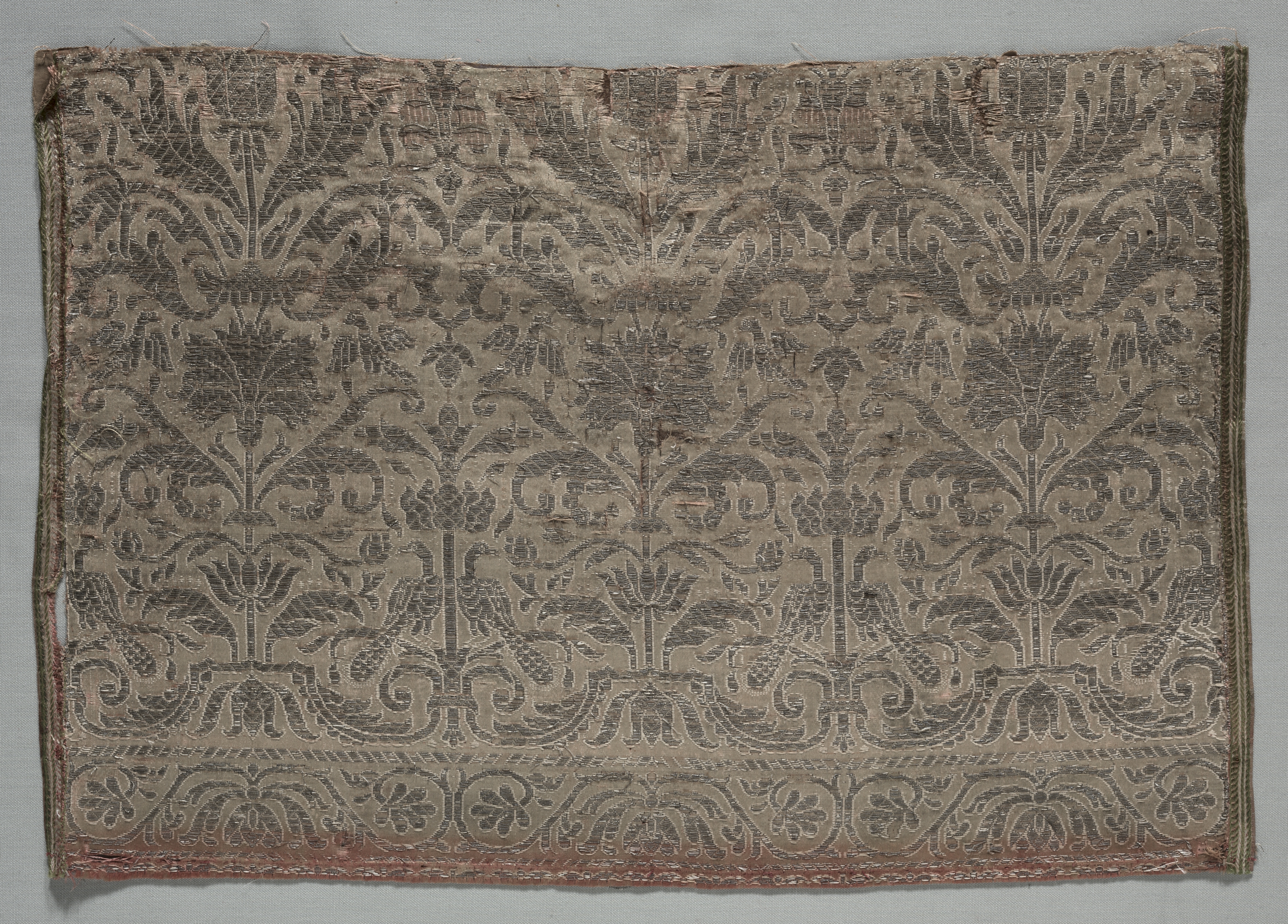 The textile fragment by artist unknown depicts a rectangular piece of fabric with a repeating pattern. The fabric is beige with a darker brown design throughout. The design consists of a repeating pattern featuring trees or plants with teardrop-shaped leaves. The pattern is symmetrical, with a central stem and branches that extend outwards. The fabric appears to be made of a thin material, possibly silk or cotton. The edges of the fabric are frayed and worn, suggesting that it may be an old or vintage piece. The background behind the fabric is a light gray color. The bottom edge has a decorative border with a stylized floral pattern.