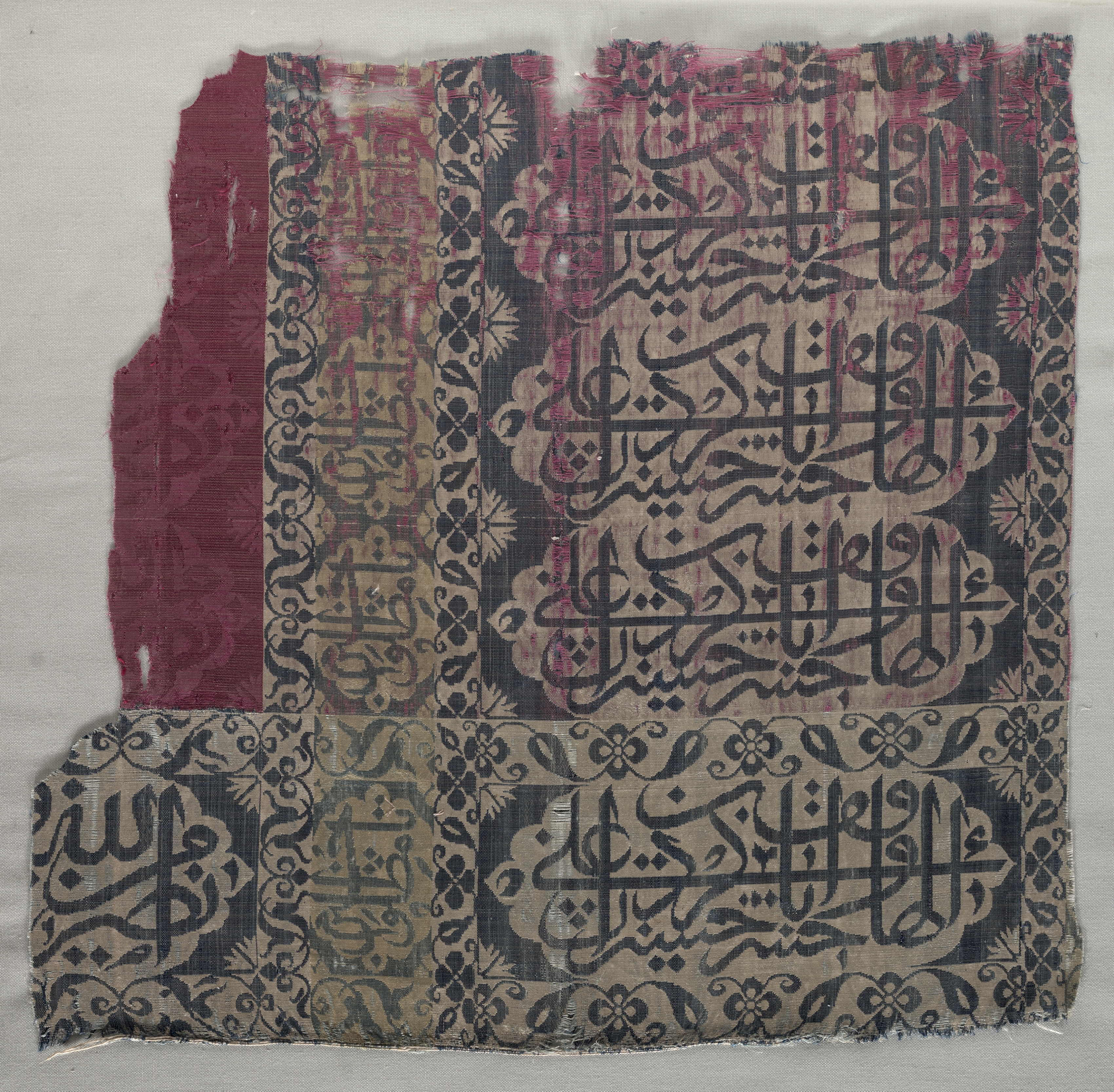 Fragment by unknown artist. Torn fabric with a red section on the left side and a patterned section on the right. The patterned section features black Arabic calligraphy on a beige background with a repeating design. The design consists of a grid with intricate black floral patterns and shapes around the calligraphy. A border of black floral patterns runs along the right edge. A smaller piece of fabric with similar design and calligraphy is attached to the bottom left corner of the main fabric. The fabric appears to be old and worn, with visible signs of aging and damage. The background is a plain white surface.