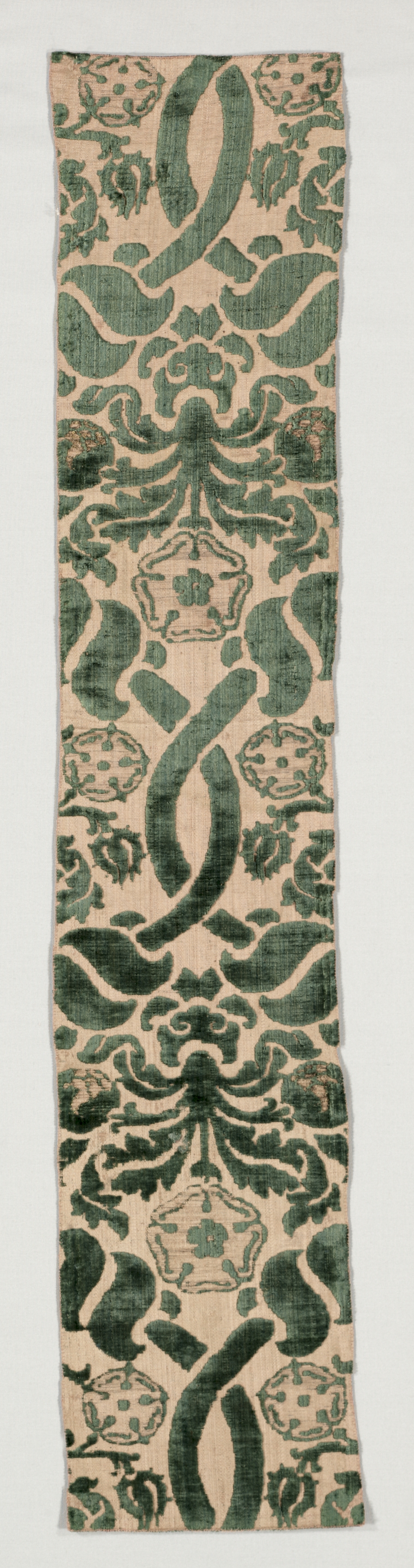 Green and beige fabric with a repeating pattern. The fabric is vertical and rectangular in shape. The beige background is visible between the green designs. The green designs are made up of curvy lines and floral shapes. The curvy lines are thick and dark green. The floral shapes are various sizes and scattered throughout. Some floral shapes resemble flowers, while others resemble leaves. The fabric appears to be a piece of cloth, possibly a textile fragment. The title of the piece is "Fragment". The artist is not specified but the piece resembles the work of artist Anni Albers.