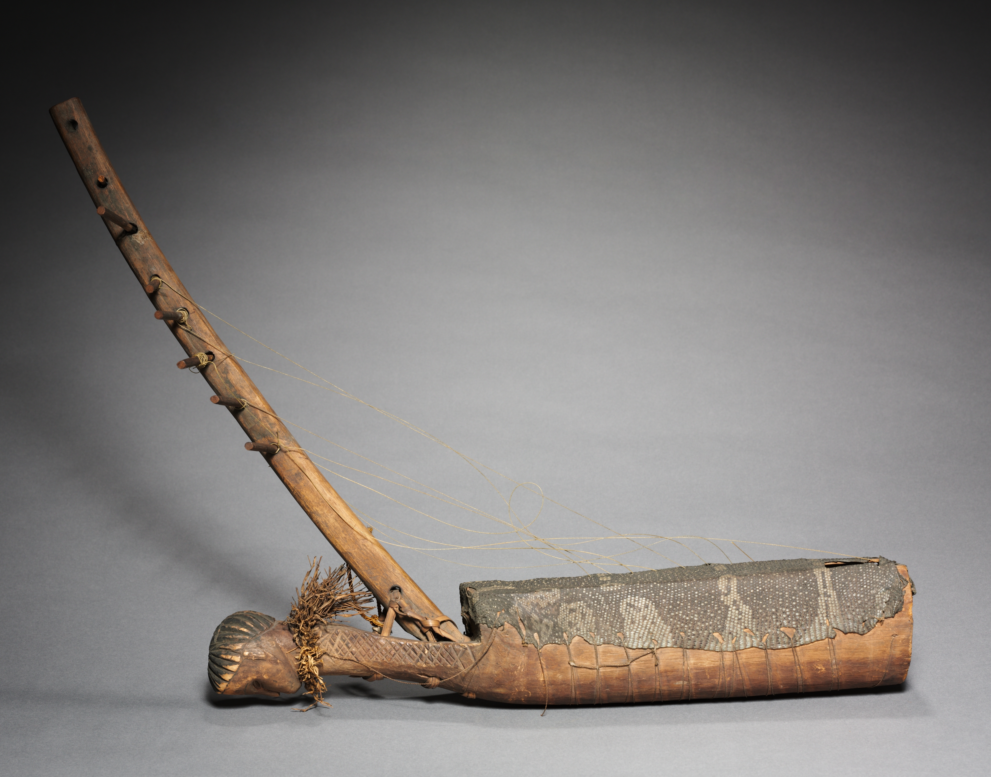 The harp has a long neck made of wood. The neck has a long, thin piece of wood with several pegs. Strings are attached to the pegs and extend down to the body. The body of the harp is a long, narrow piece of wood with a skin covering. The skin is mostly intact but has some cracks and tears. A decorative tail protrudes from the bottom. The background is a gray gradient.