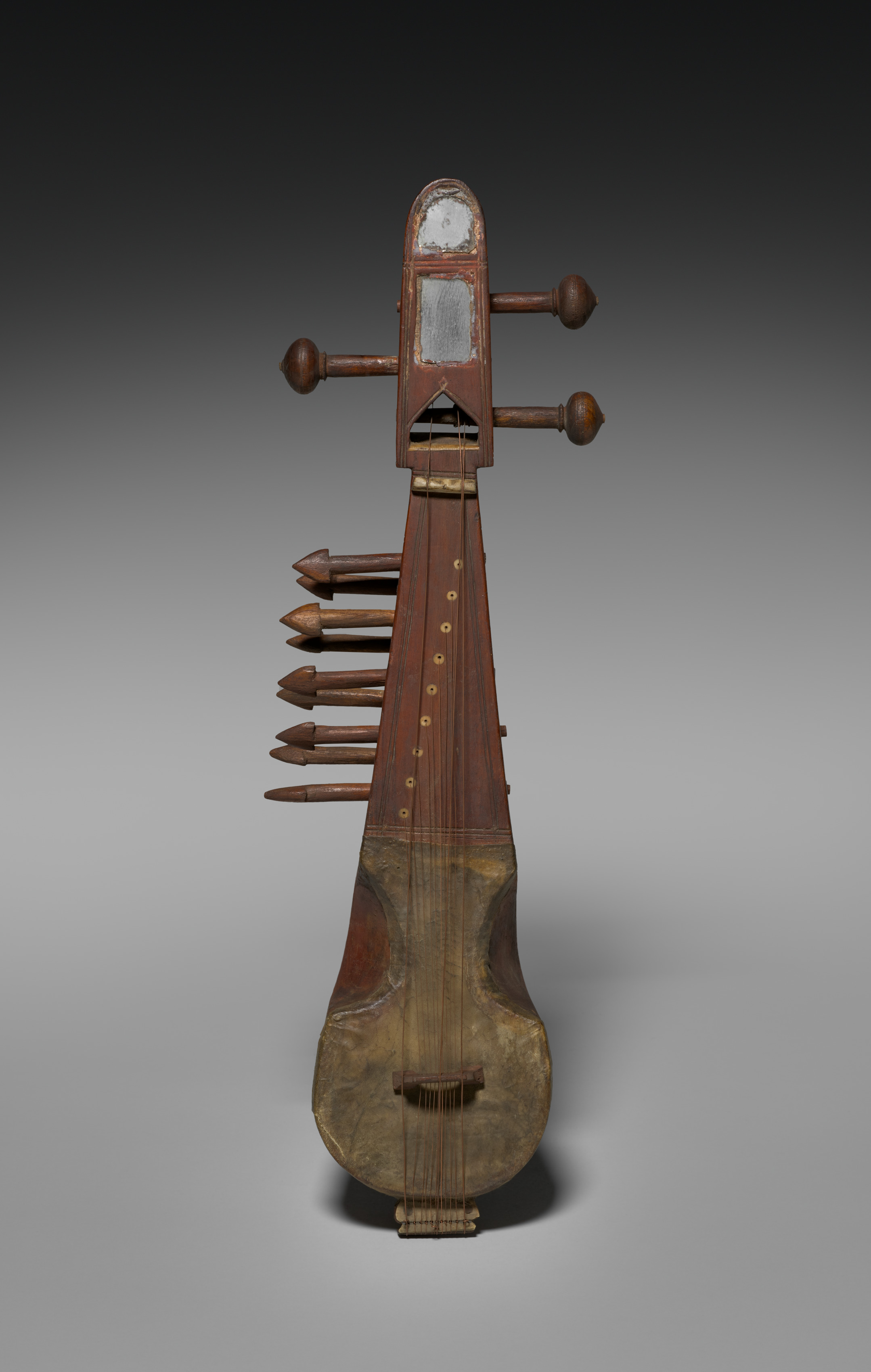 The Sarangi by unknown artist depicts a stringed instrument with a long neck and a round body. The instrument has a brown neck with a darker brown fretboard and a brass-colored body. There are several tuning pegs on the top of the neck, and several sympathetic strings attached to the side of the neck. The bridge is made of wood and has several strings attached to it. The background is a gradient from dark to light gray.