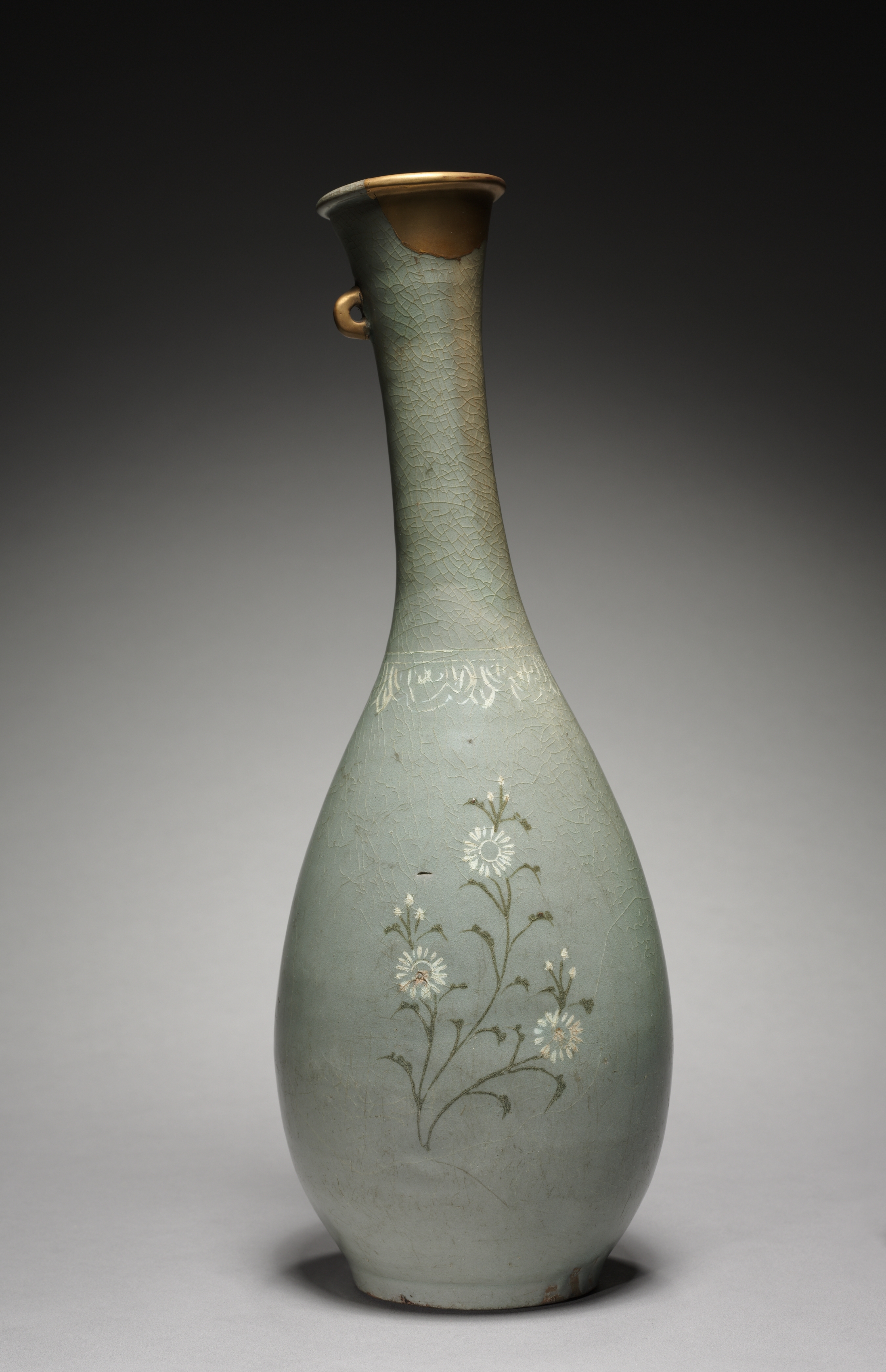 Pale green vase with a long neck and bulbous body. The vase has a small handle on the left side near the top. A floral design in white is on the front. The rim is gold colored. The background is dark at the top and light at the bottom. The title of the piece is "Bottle with Chrysanthemum Design".