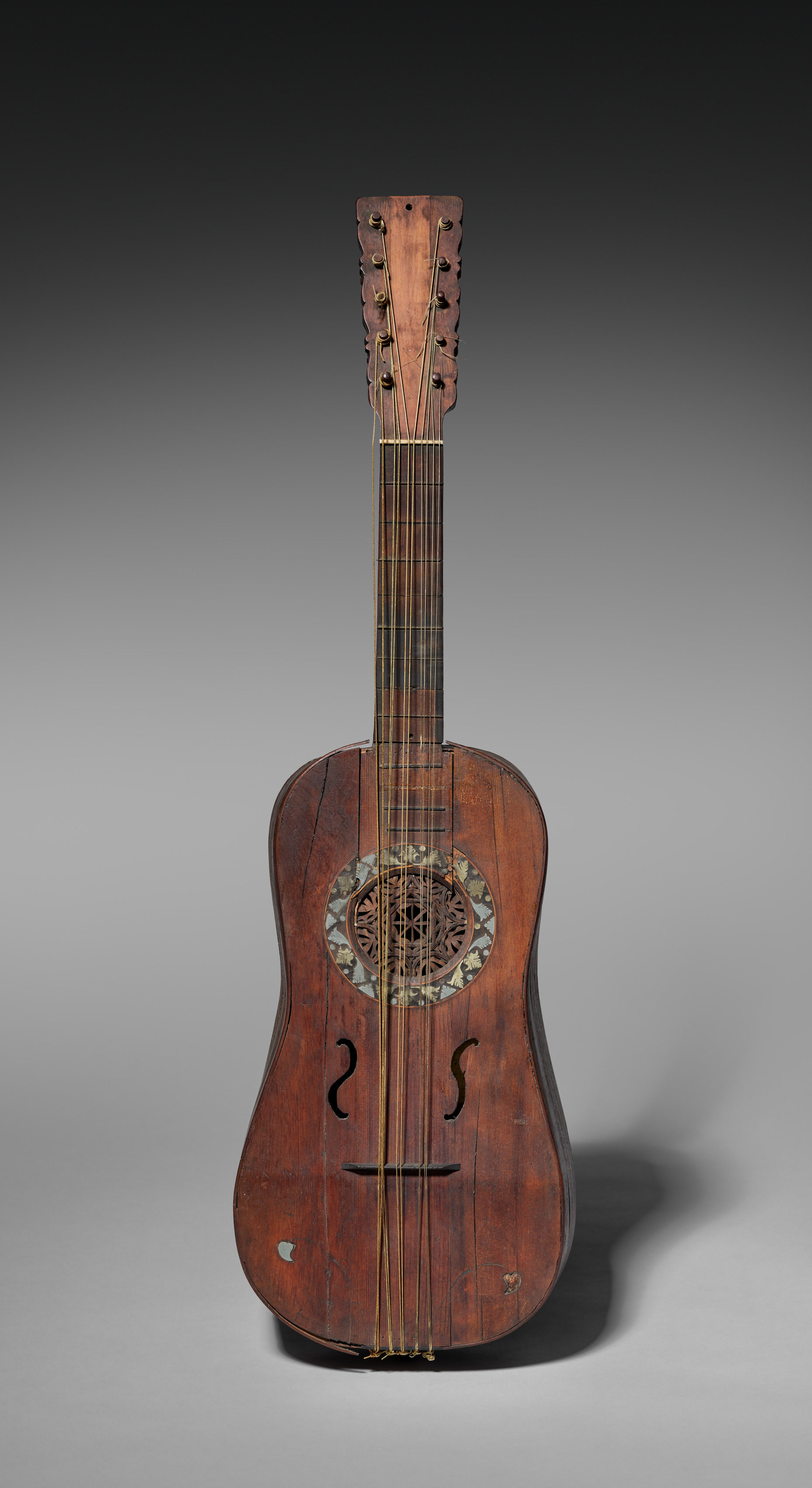 The Chittara Battente by Luigi Boissetto, is a stringed instrument with a long neck and a large rounded body. The instrument is brown with a decorative round area on the front and two curves on either side of two vertical lines. The tuning pegs are on the head of the neck. A fretboard runs along the neck. The background is a gradient from dark gray at the top to light gray at the bottom. The object casts a shadow on the right.