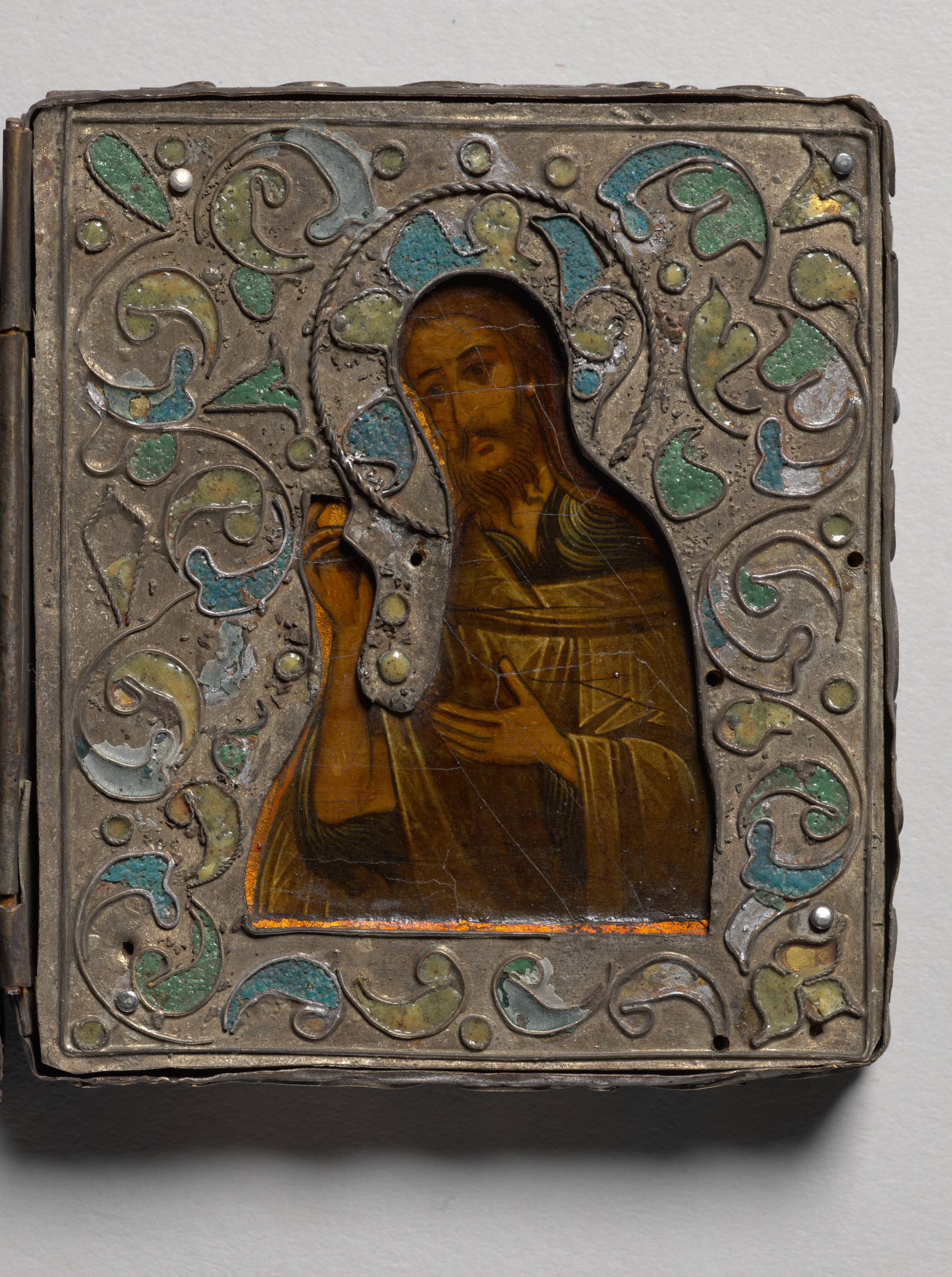 Metallic bronze-colored rectangular frame with blue and green swirls in a leaf-like pattern. The frame surrounds a central portrait. The portrait depicts a man with long dark hair and a beard. He wears a brown robe and has a halo. His left hand holds his robe and his right hand holds an object. The portrait is in a golden color. The background of the image is gray. The title of the piece, St. John the Evangelist, reflects the identity of the man in the portrait.