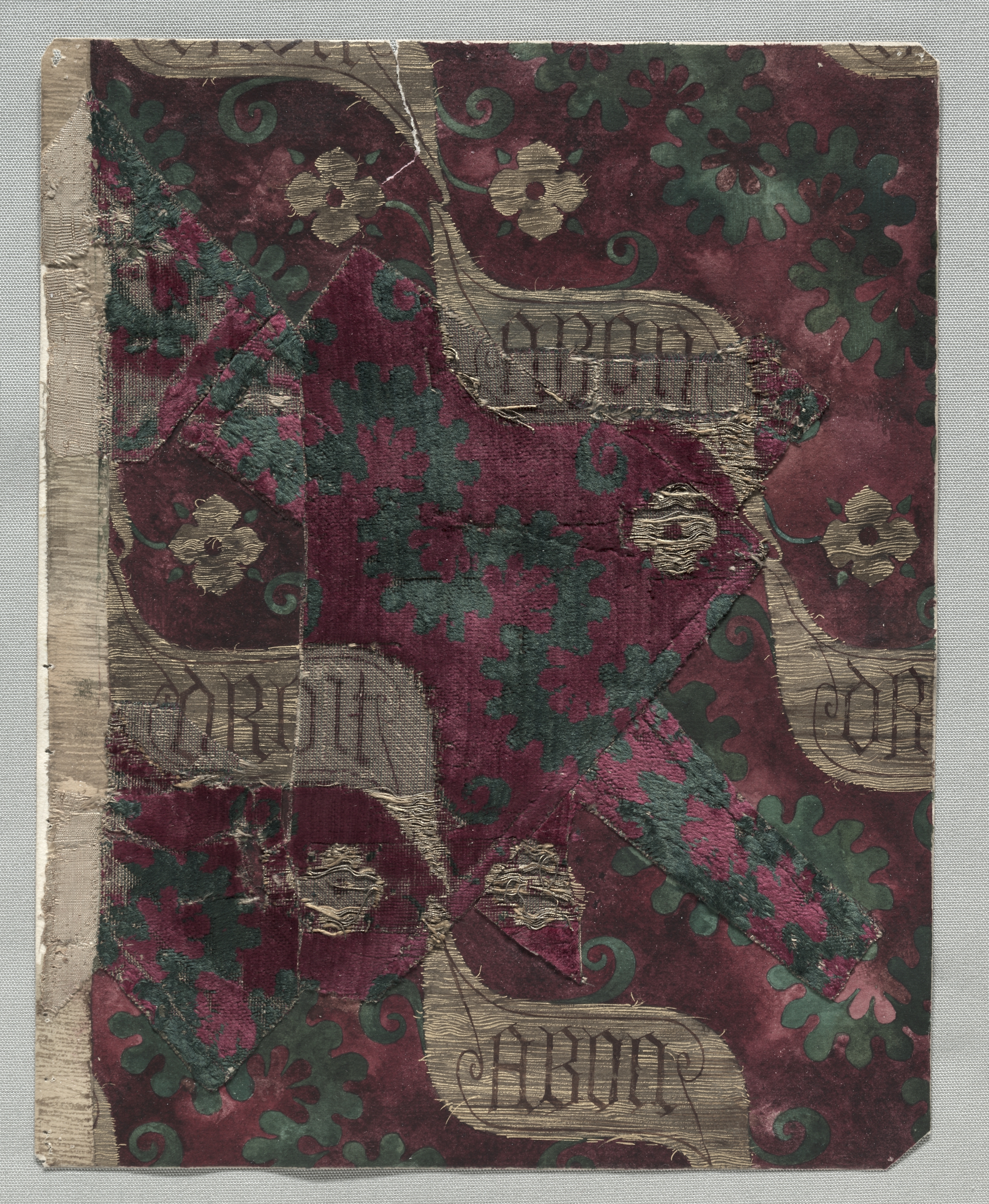Velvet Fragment by Albrecht Dürer: A rectangular piece of fabric with a maroon background and a repeating pattern of green leaves and flowers, with four beige banners scattered throughout that each contain a black gothic-style inscription. The fabric has a frayed edge on the left side.