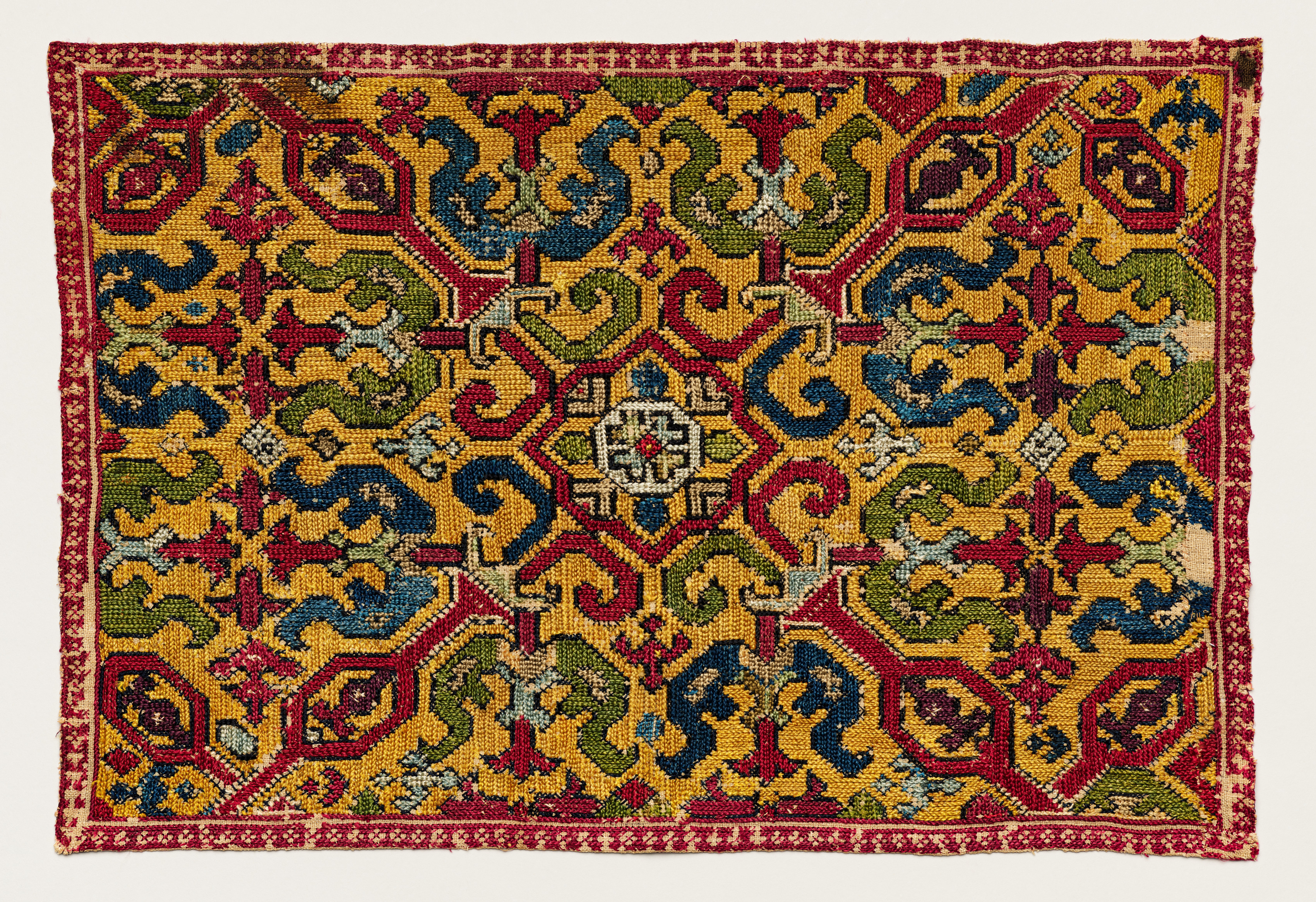 Yellow rectangular textile with a red border and intricate design. The design features a repeating pattern of interconnected shapes in red, blue, green, and white. The shapes include hexagons, diamonds, and curved lines. The textile appears to be a fragment, with rough edges and fraying around the edges. The background of the image is white.