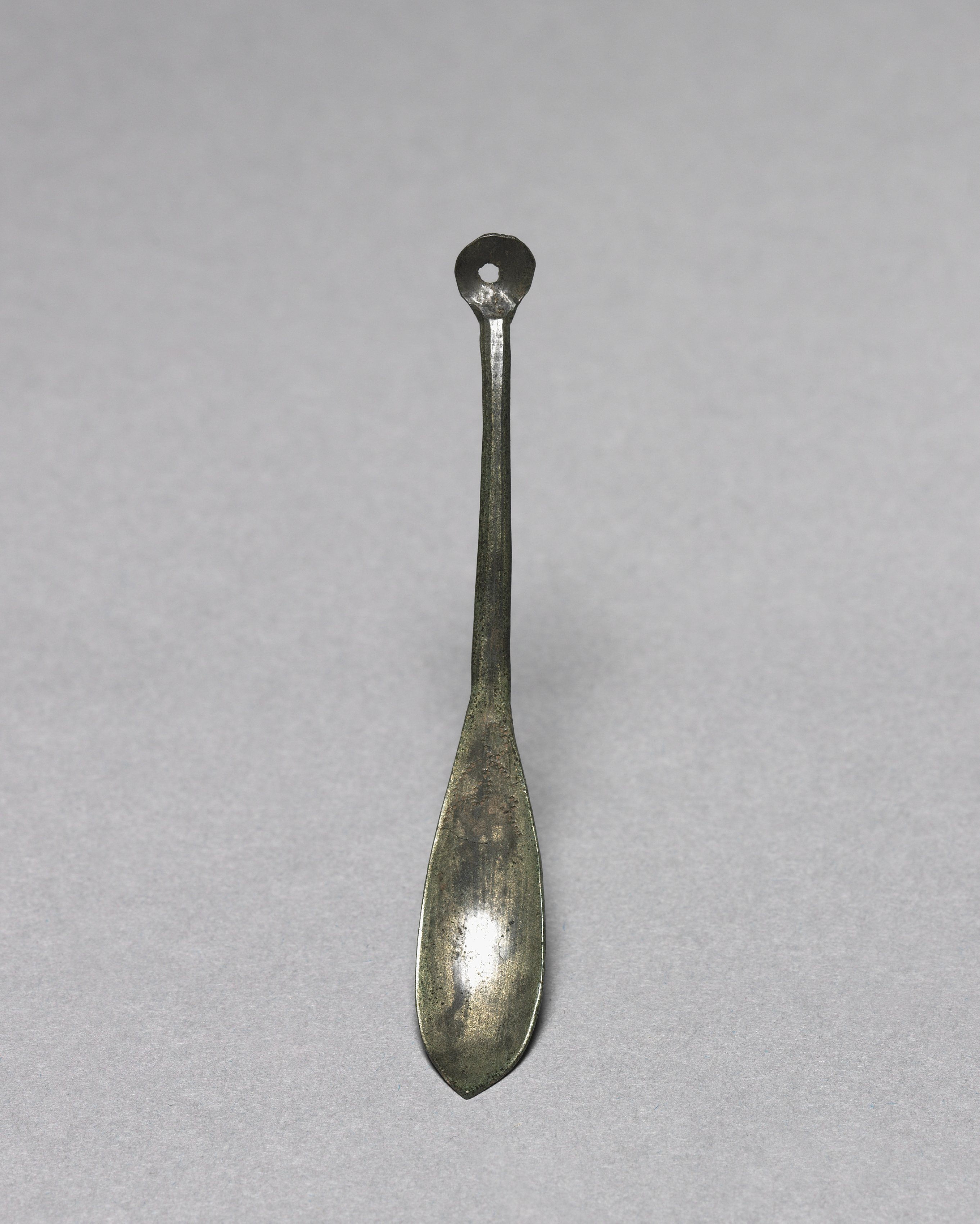 Metal spoon with dual heads by Spoon with Dual Heads. The spoon is made of a dark-colored metal, likely silver or silver-plated, with visible signs of wear and tarnish. The handle is long and slender with a small circular hole at the top. The spoon head is oval-shaped. The background is a plain gray surface.