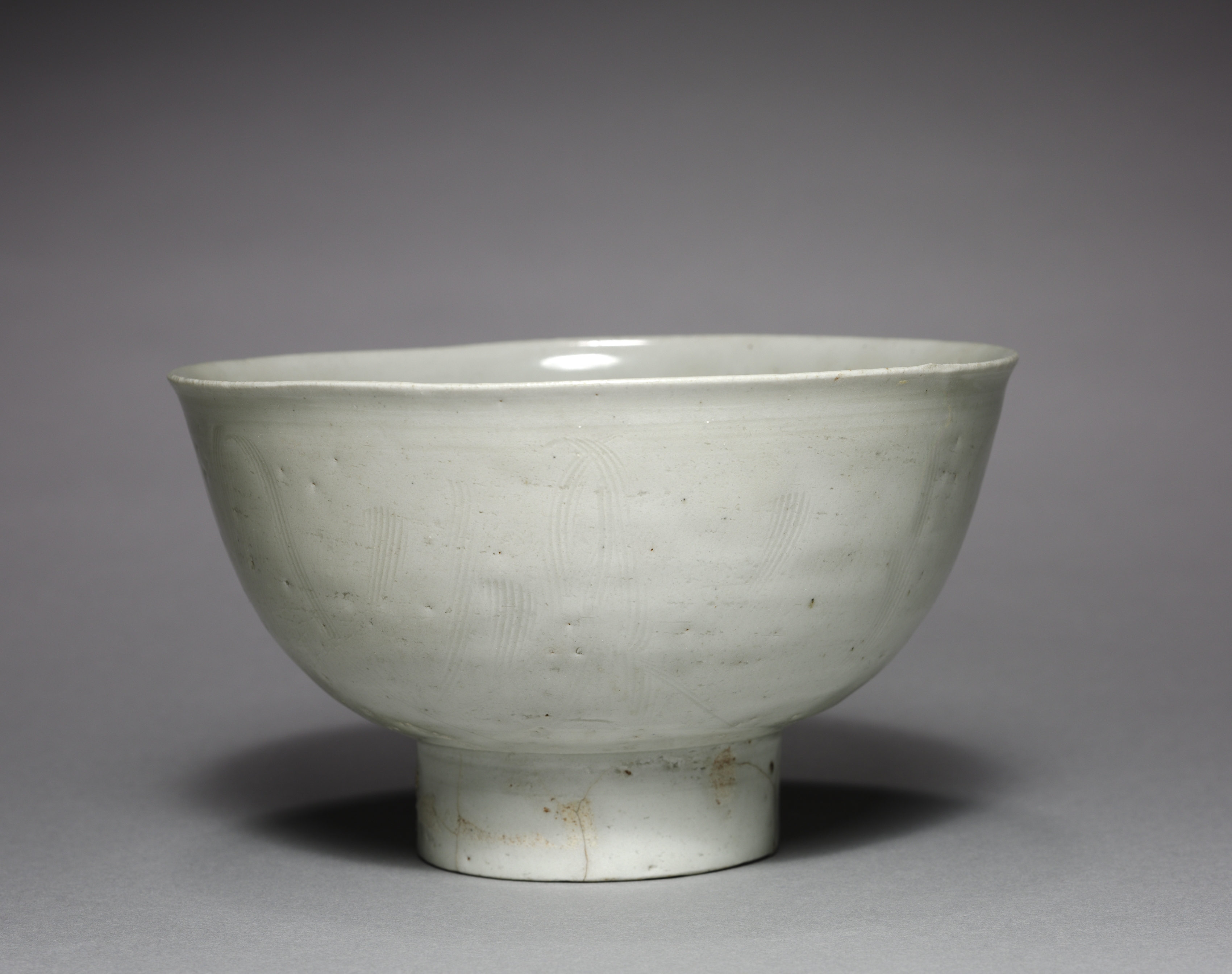 White ceramic bowl with a wide mouth and a narrow base. The bowl has a glossy finish and features a simple, rounded shape. It sits on a short, cylindrical foot. The exterior surface displays subtle, darker speckles and lighter-colored scratches or marks. The interior is smooth and shiny. The background is a gradient gray color, transitioning from dark at the top to light at the bottom. A shadow is cast directly beneath the bowl. The artist of the bowl is not visually described; however, the title given is "Bowl".